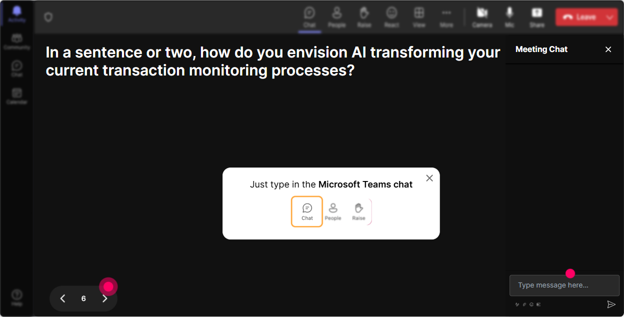 Kick things off by asking: 'How familiar are you with AI and digital transformation in transaction monitoring?' Instantly gauge where everyone stands and tailor your presentation accordingly.