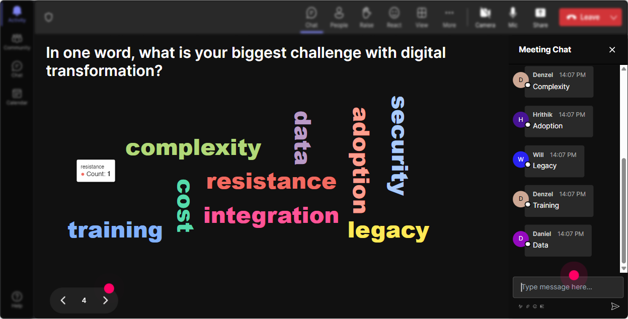 Invite participants to describe in a few sentences how AI and Digital Transformation impact their day-to-day roles. Watch their insights cascade onto the screen like dynamic tiles, sparking a visually engaging discussion.