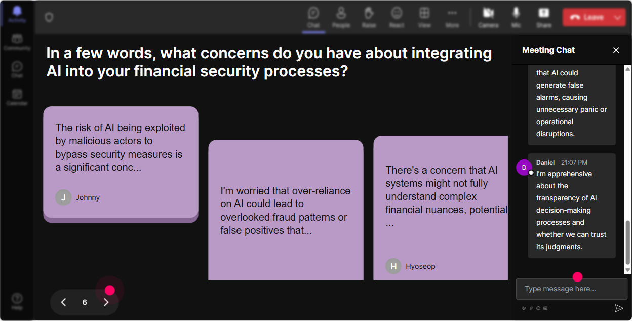Get interactive with Talking Tiles! Ask your team how AI security influences their day-to-day tasks. As they type in their thoughts, watch them transform into falling tiles on the screen, creating a captivating visual dialogue that keeps everyone engaged.