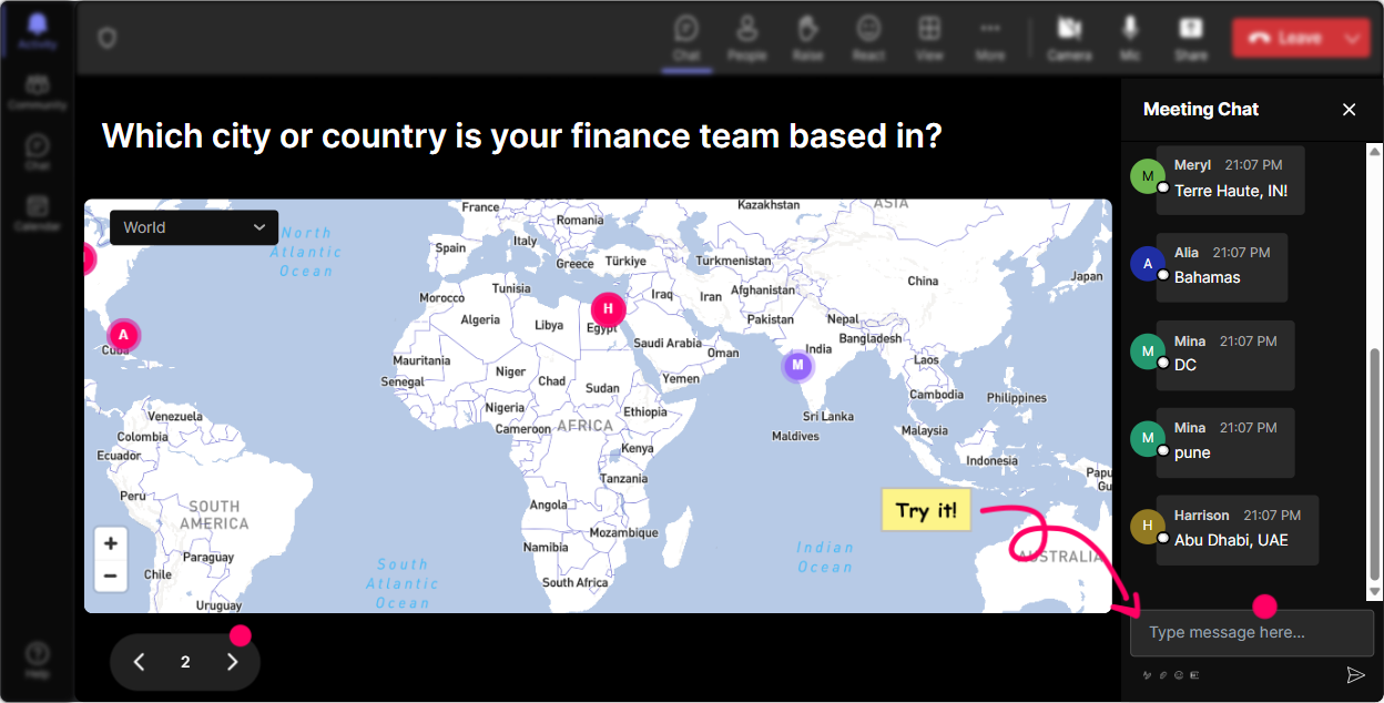 Kick things off by asking your finance team where they're tuning in from. Use StreamAlive's Magic Maps to instantly plot their geographical locations on a real-time earth map. It's a great icebreaker and sets a global stage, literally! Try questions like 'Where are you joining us from?' or 'Which city holds your fondest memory of finance conferences?' to get the conversation rolling.