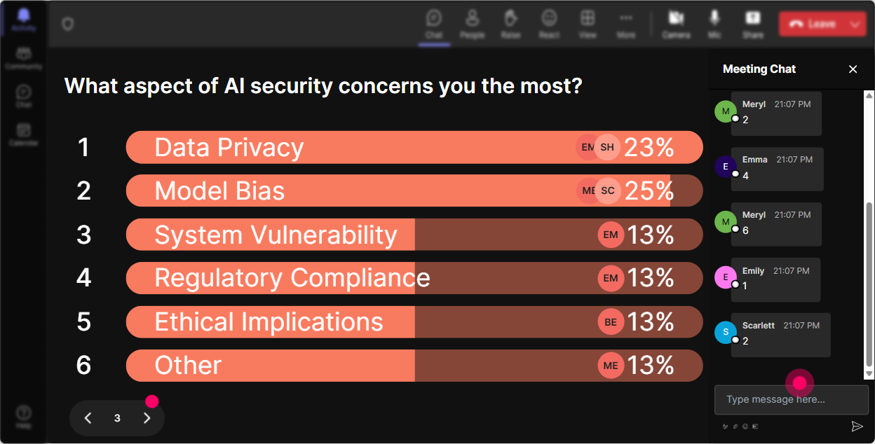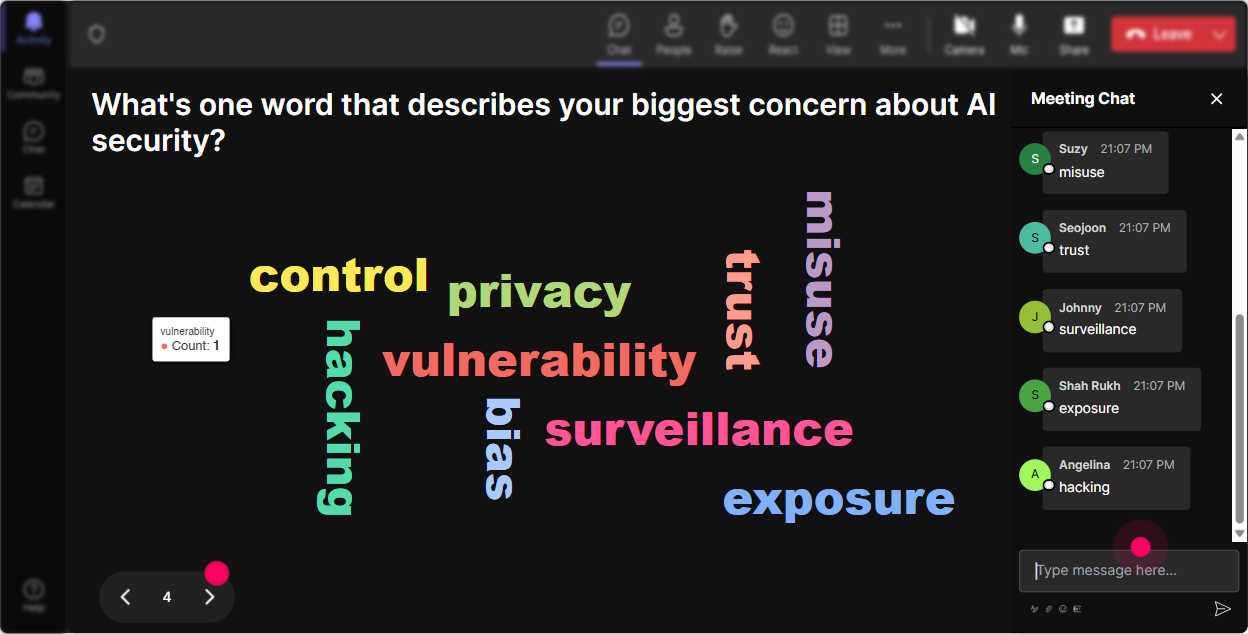 Keep your session lively with a Quiz on key AI security concepts. Pose a multiple-choice question where only one answer rings true and use the quiz feature to tally responses. This helps reinforce learning and keeps everyone alert.