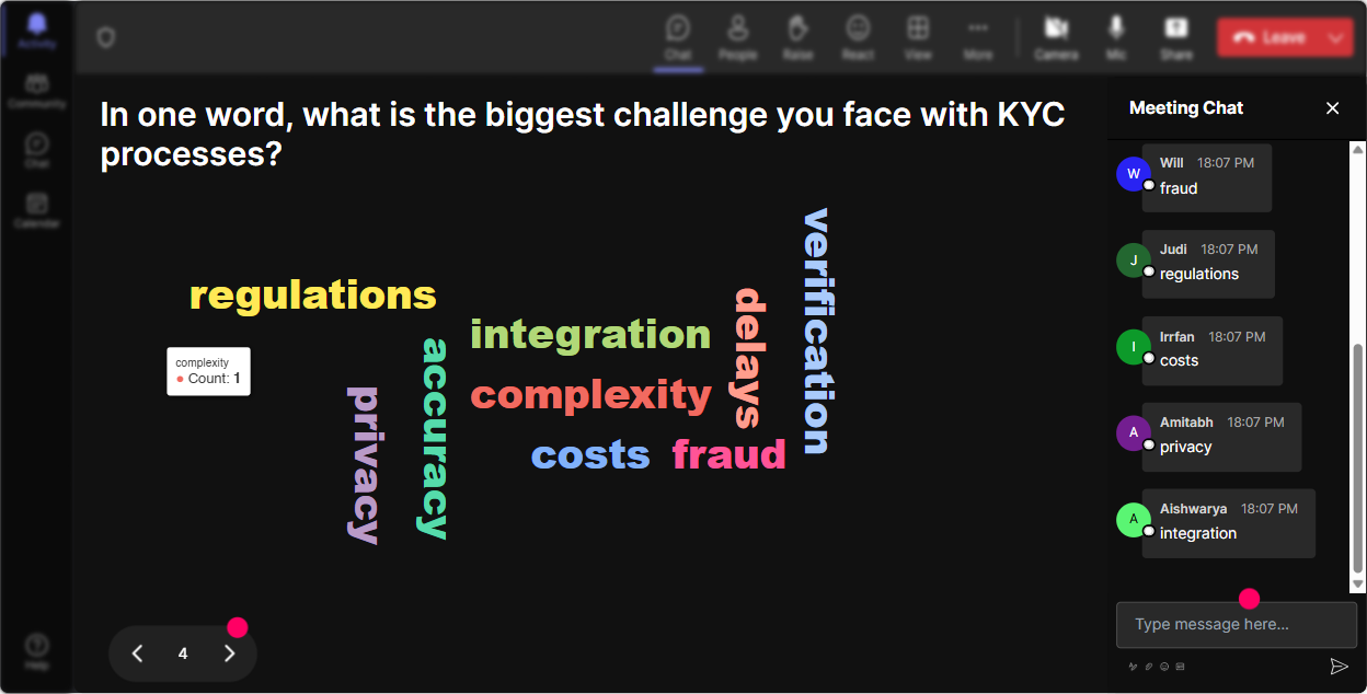 Engage with Wonder Words by asking, 'How do you feel about KYC compliance?' Let their one-word responses like 'excited,' 'challenging,' or 'overwhelming' grow into a dynamic word cloud that reflects the room's overall mood.