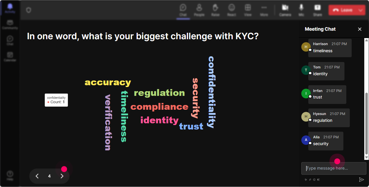 Use Wonder Words to gauge the room's emotions about KYC training. Ask them to fill the chat with words that describe how they feel about this subject: "Excited," "Curious," or "Overwhelmed"-watch these feelings form a living word cloud.