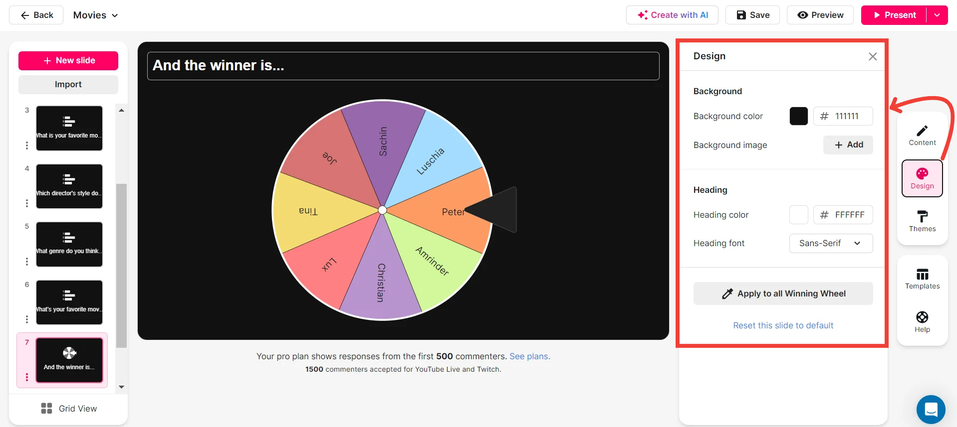Engage your students visually by tailoring the look of your Spinner Wheel to suit your session theme or educational focus. This customization enhances the visual appeal, making every spin a captivating event that encourages participation.