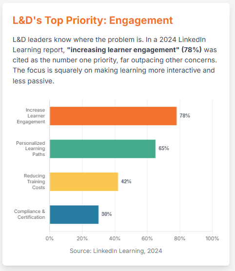 In a 2024 LinkedIn Learning report, "increasing learner engagement" (78%) was cited as the number one priority, far out pacing other concerns. The focus is squarely on making learning more interactive and less passive.