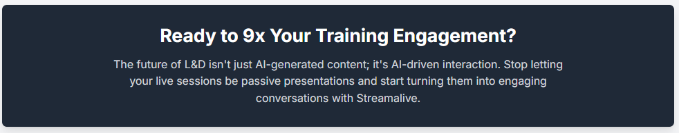 Data indicates that presenters and trainers using StreamAlive generate 9x more engagement in their sessions compared to those who don't.