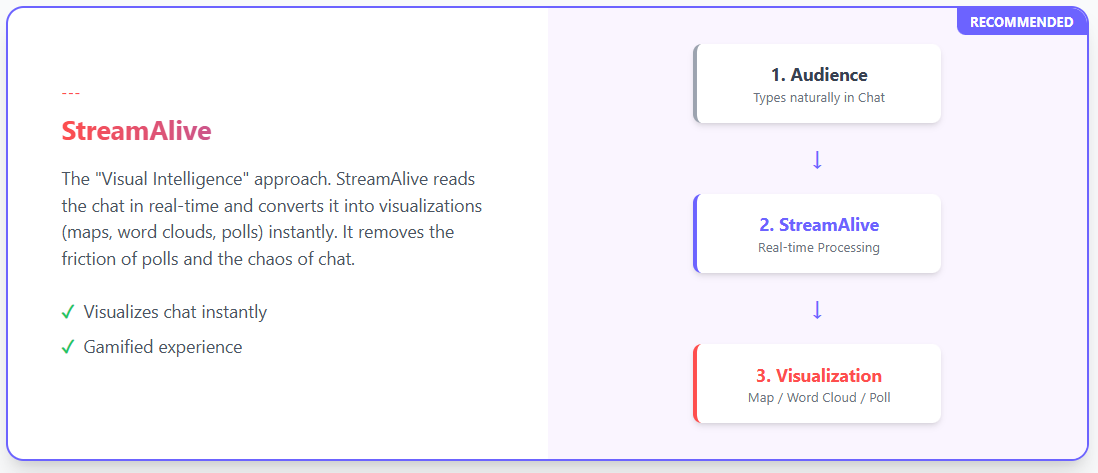 Verdict: StreamAlive is the recommended engine for general team meetings, workshops, and webinars. By transforming the chat into a visual database, it solves the "Silent Room" problem without breaking the flow of communication.