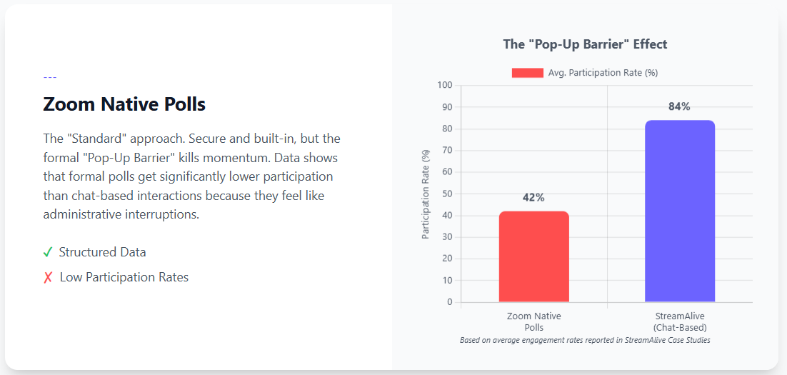 Verdict: Use Zoom Native features for formal voting, compliance training, or attendance verification where data auditing is more important than engagement.