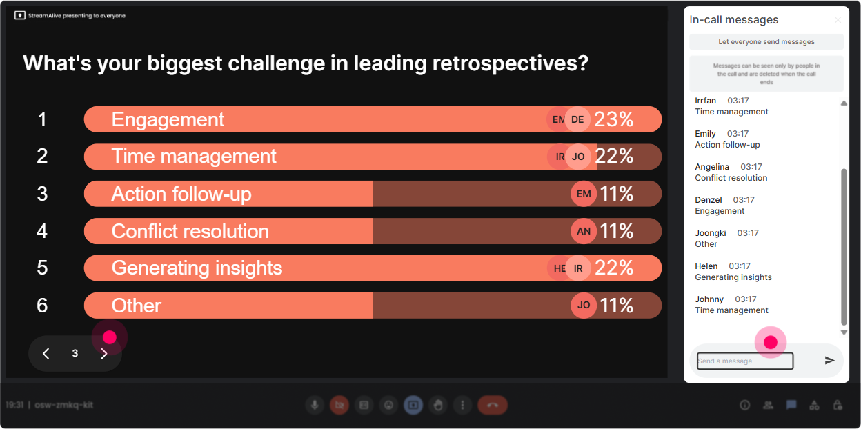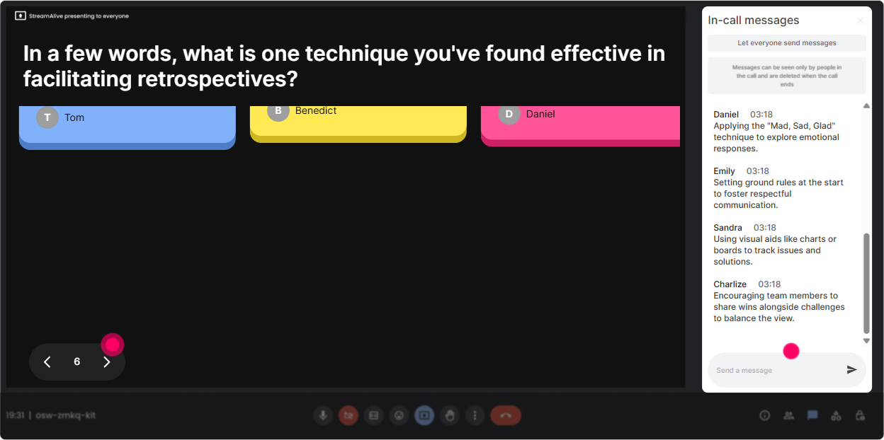 Sometimes you need more than 12 words-you need examples. **Talking Tiles** lets people type real experiences in chat, and their responses show up like a dynamic message wall (way more engaging than reading lines of chat). **Prompts that work really well for Agile Team Leaders:** - Describe a retro that went off the rails-what happened? - Whats one thing youve tried to improve retro action follow-through? - Whats the hardest personality type you manage in retros, and why? **Trainer tip:** After the tiles appear, pick 23 themes youre seeing (like dominant talkers, no time, actions ignored). Then teach directly to *their* reality. This is how you stop the session from feeling generic.
