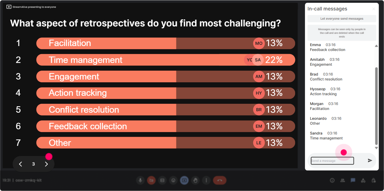 Sometimes you need more than one-word answers-especially when you’re teaching facilitation. Talking Tiles lets people write fuller responses in chat, and StreamAlive turns them into a fun, visual cascade on-screen. It feels like the room is “talking,” not just you. Use Talking Tiles for practical retro learning: - “What’s one retro moment that went off the rails for you?” - “What impact does a good retro have on your team’s delivery?” - “Finish this: ‘My retros get stuck when…’” - “What’s one thing you want to change about how your team runs retros?” Trainer tip: When tiles start dropping in, pick 2–3 themes you see and teach from that. It makes the training feel custom-built for that exact group.