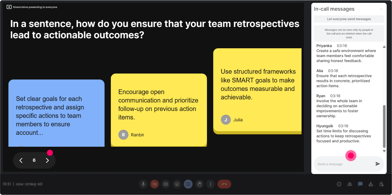 In live trainings, good questions get buried fast. StreamAlive’s Q&A pulls audience questions from the chat and displays them cleanly, so you don’t miss the important stuff. How to use it in your retro session: - Tell them: “Drop questions anytime-StreamAlive will collect them for us.” - Do a dedicated stop: “Let’s hit the top 3 questions before we move to action planning.” - Use it for sensitive topics: People often ask the real stuff here, like: - “How do I deal with a manager dominating the retro?” - “What if the team refuses to do action items?” - “How do I run retros with very low trust?” Trainer tip: When you answer, link it back to a tactic they can try next sprint. Agile folks love “what do I do Monday morning?” answers.