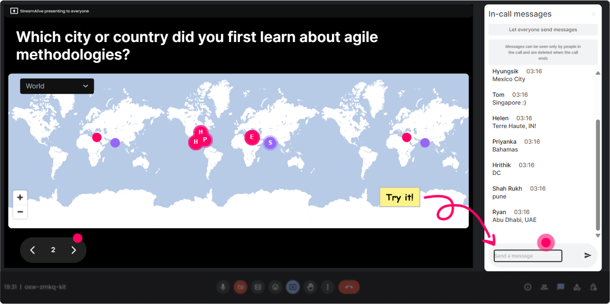 This is the easiest way to break the ice without forcing awkward introductions. Ask one location-based question in chat and StreamAlive instantly plots everyone on a live world map. How to use it in your Retrospective training: - Kick-off question: “Where are you joining from today?” (simple, works every time) - Agile-friendly variation: “Where is your team based most of the time?” (great for distributed teams) - Warm-up with a twist: “If you could run your next retro anywhere on earth, where would it be?” Trainer tip: When you see clusters (like lots of folks from the same city), use it to spark quick conversation: “Looks like we have a mini Agile hub in Bangalore-what are you all working on?” It takes 10 seconds and suddenly people feel seen.