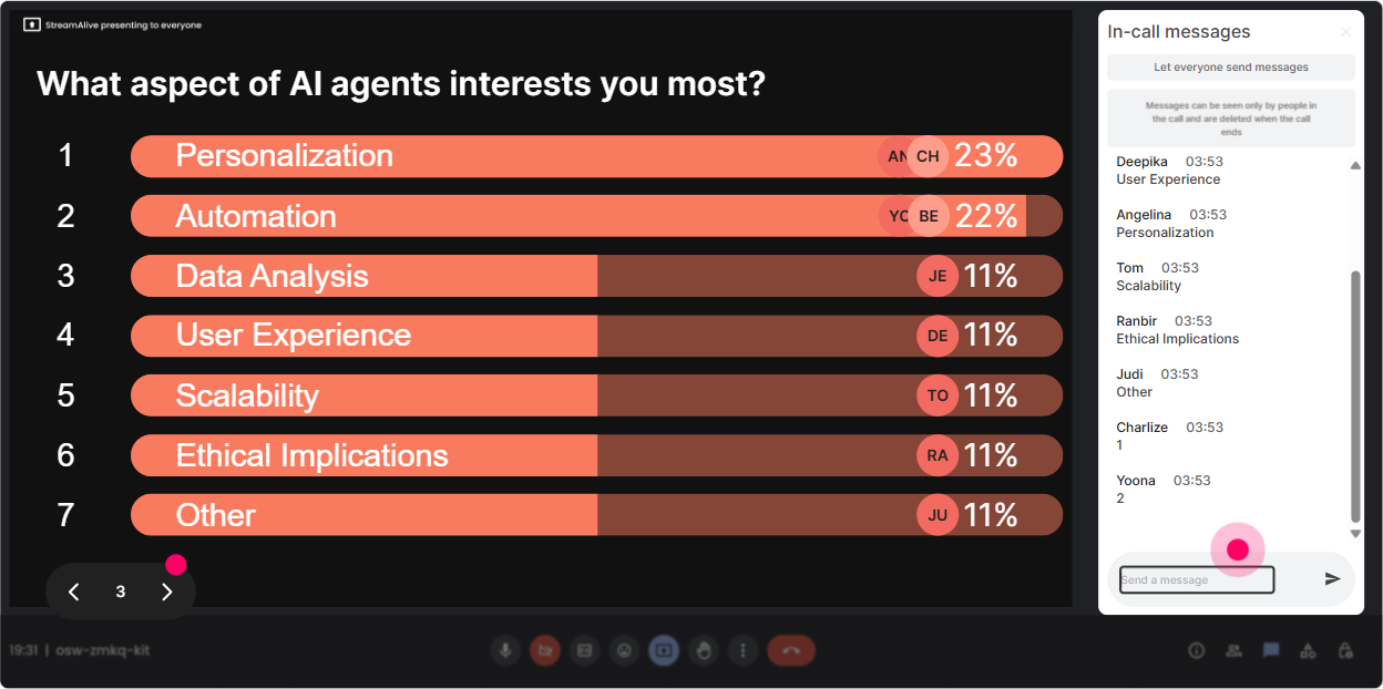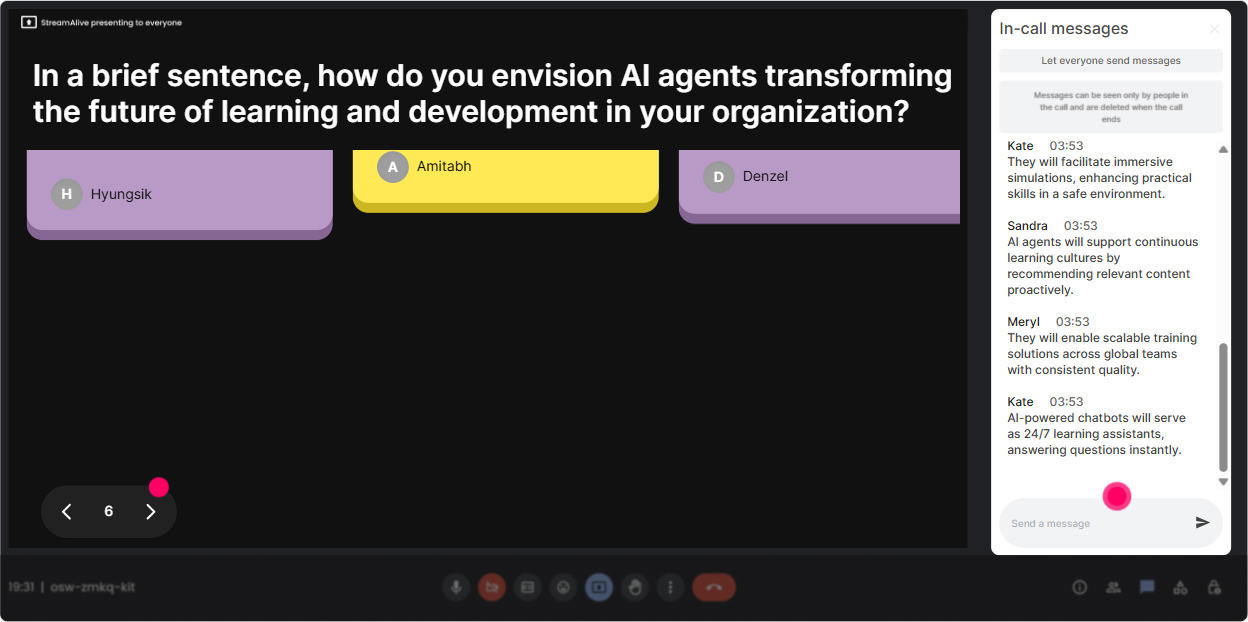 In a live session, great questions get buried in chat. StreamAlives Q&A pulls them out and organizes them so you can actually manage them like a pro-without constantly scrolling. How it helps in AI Agents training: - During complex parts (governance, risk, data privacy), tell people: Drop questions anytime-StreamAlive will collect them. - Use it for a structured parking lot: Well do a Q&A break every 15 minutes-keep them coming. - End with confidence: Lets tackle the top questions the room asked-so we leave nothing hanging. Trainer tip: Call out patterns: Weve got 6 questions about security and 4 about implementation-lets handle those as themes. It feels clean and satisfying.