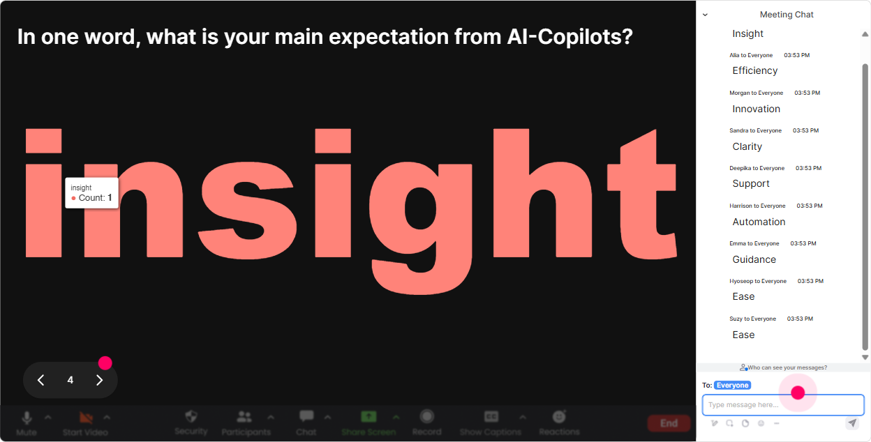 AI-Copilots can trigger mixed feelings-excitement, skepticism, fear, curiosity. A Word Cloud lets you SEE that instantly, and it makes people feel heard. Great prompts for your AI-Copilots training: - In ONE word: how do you feel about AI-Copilots in training work? (excited, nervous, curious, etc.) - Whats the #1 thing you want AI to help you with? (design, outlines, quizzes, marketing, facilitation) - One word you associate with prompting. Why its a win: - You get instant buy-in because the session starts with their reality. - You can address resistance without calling anyone out (Im seeing concerned popping up-lets talk about whats behind that.). Trainer tip: Use Combine Similar Answers so you dont end up with excited vs exciting vs so excited as separate entries.