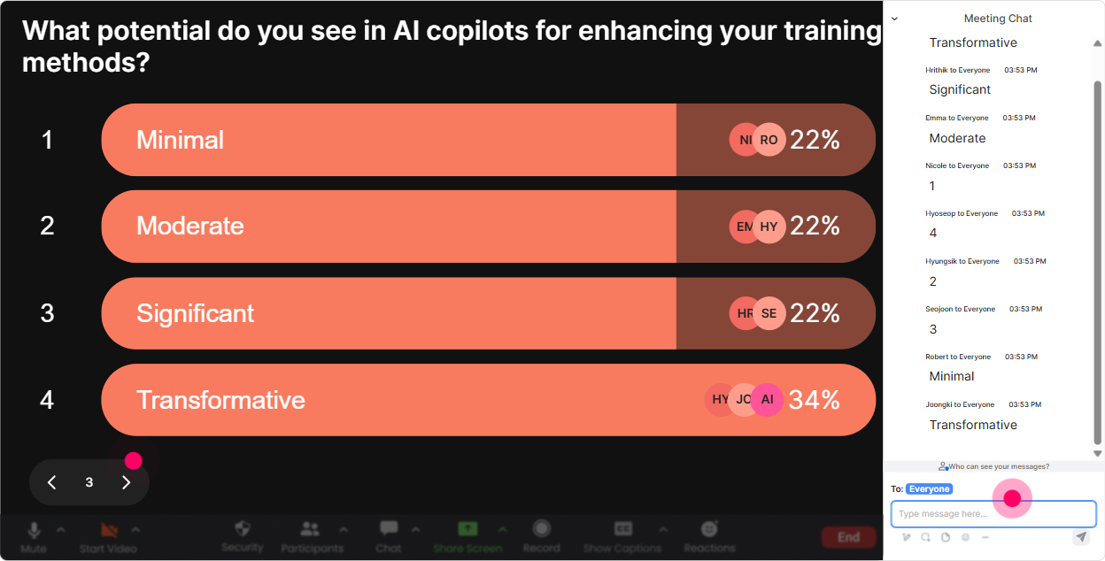Before you go deep into prompts, workflows, and policy you need to know where people are starting from. Rating Polls let people answer fast, right in chat, and you see the mood instantly. Use it like this: - On a scale of 110, how confident are you using AI-Copilots in your day-to-day work? - Rate your agencys readiness for AI-Copilots adoption (1 = not ready, 10 = fully rolling). - Mid-session pulse check: How clear is this so far? 1 = lost, 10 = crystal. Why it works: - People who wont speak up will still vote. - You can adjust your pace in real time (Looks like were at a 46 average. Lets do one more example together.).