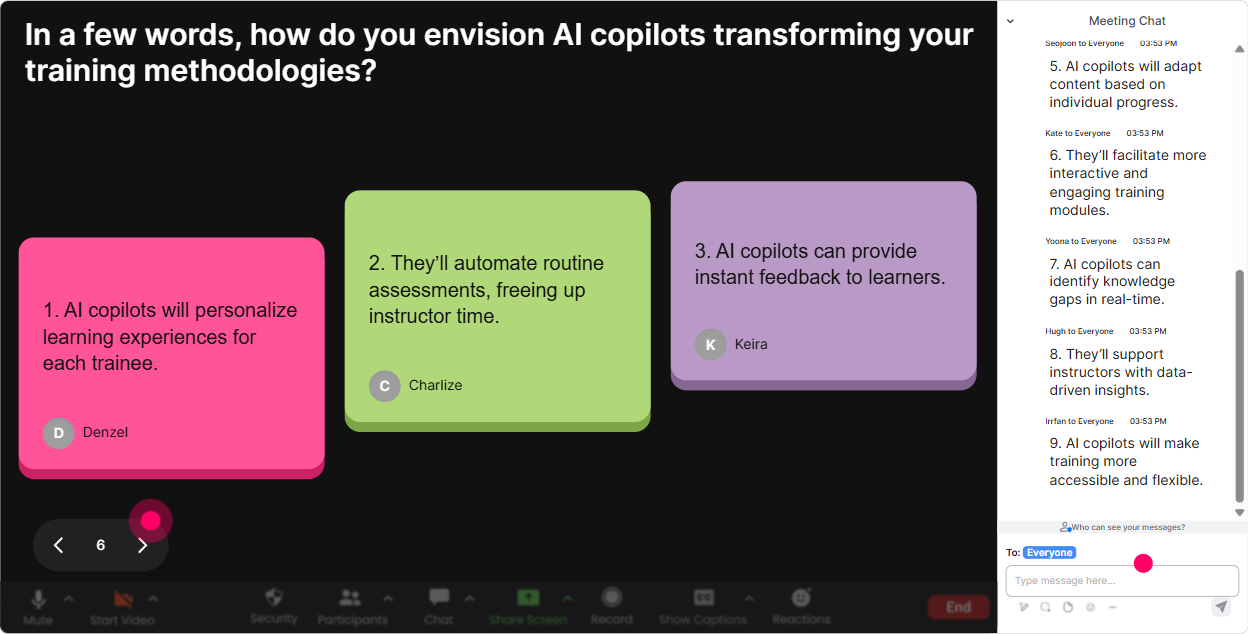 When you want more than a one-word answer-but you still want it to feel playful-Talking Tiles is perfect. People type in chat, and their responses become moving tiles on-screen. Use it during AI-Copilots training like: - Whats one training task youd LOVE to hand off to an AI-Copilot? - Whats your biggest worry about using AI in your training agency? - Share a real training scenario you want to build an AI prompt for (one sentence). Why it boosts engagement: - You get richer input without turning it into a slow round-robin. - Its visually attention-grabbing, so even quiet attendees look up. Trainer move: Pick 23 tiles live and say, Lets build a prompt for THIS one together. Now your audience is co-creating the session.