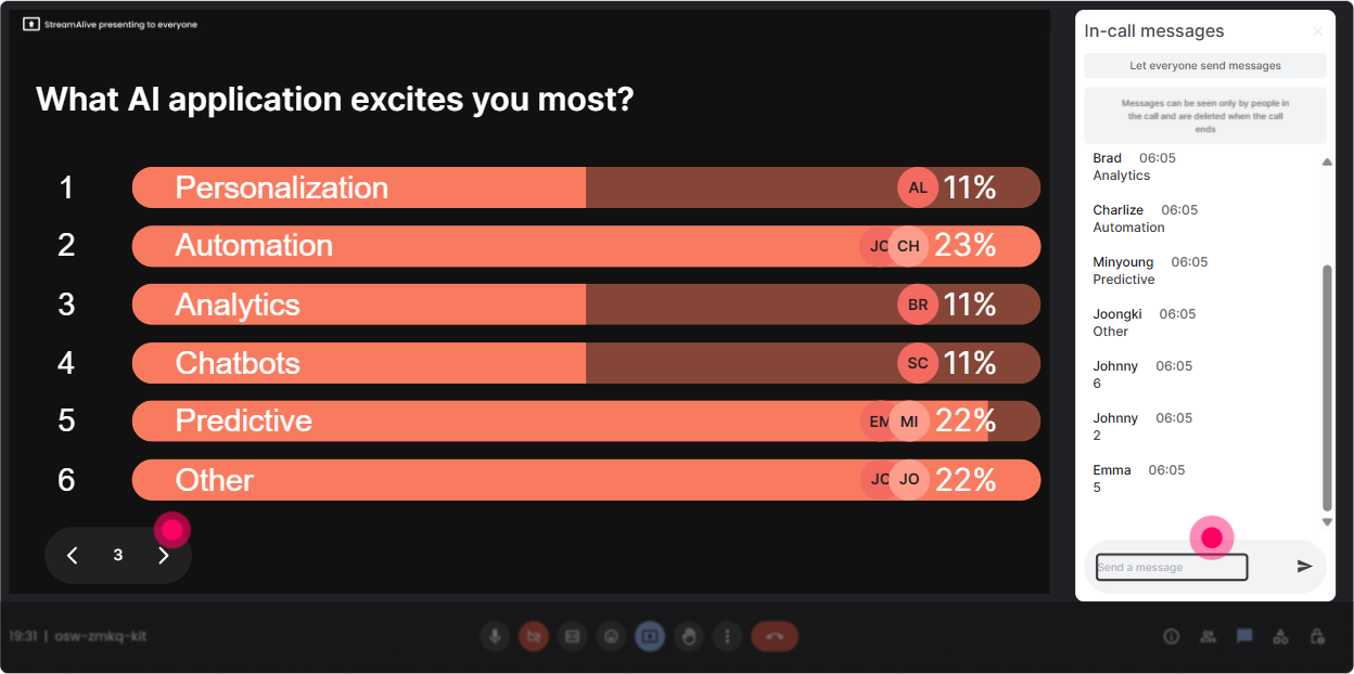 This is your easiest everybody participate opener-and it instantly makes the room feel alive. **How to use it in AI Fluency training:** - Kick off with: **Where are you joining from today?** and let StreamAlive plot everyone on a real-time world map. - Then tie it back to the topic with: **Pick a city where you think AI adoption is happening fastest right now.** (Great segue into AI in the workplace.) - Or do a values-based warm-up: **If AI gave you back 5 hours a week, where on earth would you travel first?** **Trainer tip:** If youre running a global L&D group, those map clusters become an instant talking point: Wow, big cluster in Singapore-what are you seeing there with AI in learning?