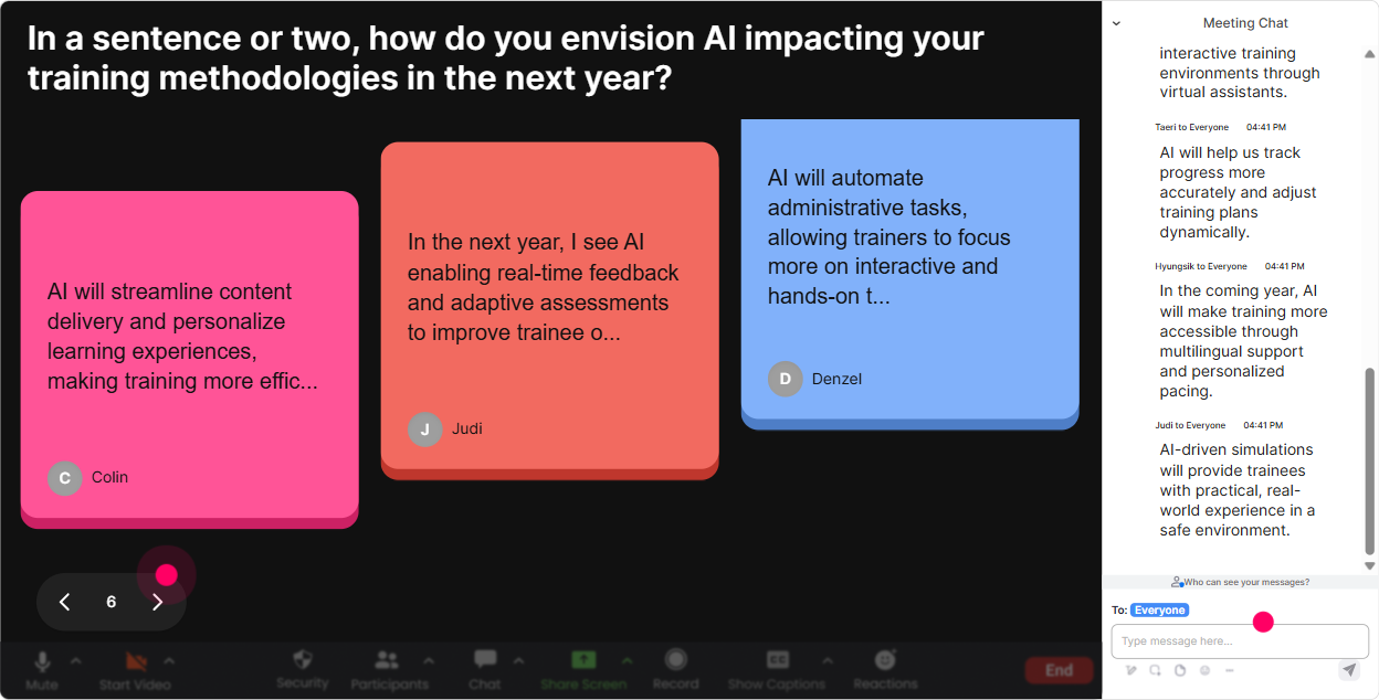 When you want more than one-word answers, Talking Tiles is gold. People type in chat, and their ideas show up as falling tiles-so the conversation feels alive. Talking Tiles prompts for Training Agencies learning AI Fluency: - In your role, where could AI save you 30 minutes a day? - Whats one training task youd love to automate (without losing quality)? - Describe a real client request where AI could help your team deliver faster. - Whats one risk you need to manage if trainers use AI in content creation? Why it boosts engagement: even the quiet folks contribute because its easier to type than to unmute. And as the tiles stack up, you get a ready-made list of discussion themes. Facilitation move: pick 3 tiles and say, Lets unpack these-who wrote this one? Instant participation, without awkward cold-calling.
