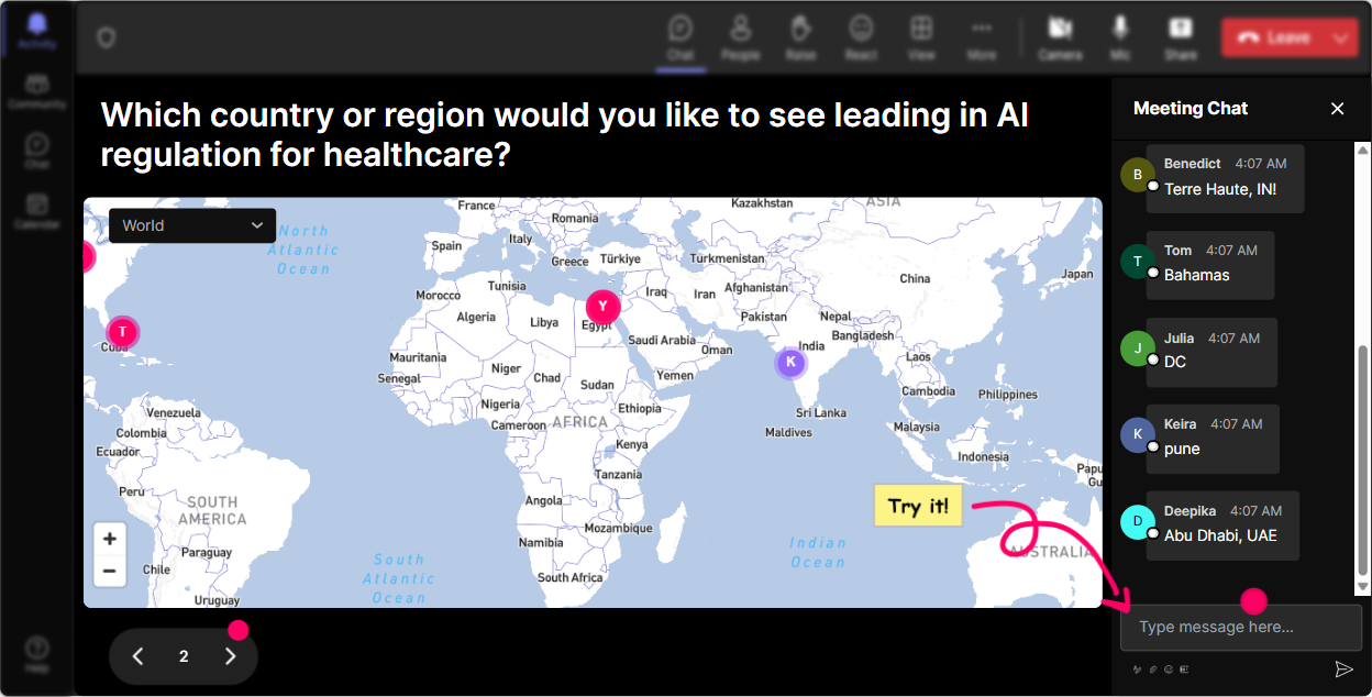 Break the ice by checking in with your folks using Magic Maps. Ask them, 'Which area of AI regulation do you find most challenging in your region?' Watch as StreamAlive decorates the map with their responses, an excellent way to visualize global challenges and opportunities in AI regulation.