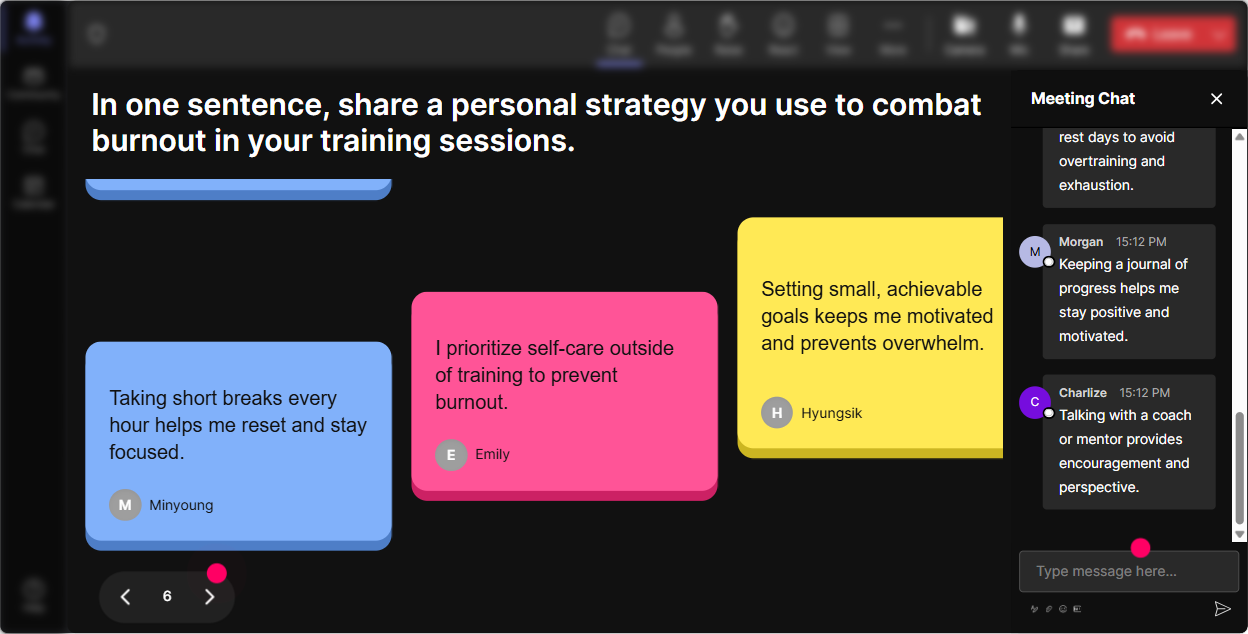 Burnout and change fatigue show up differently for everyone. Talking Tiles lets people share short real-life experiences in chat, and it turns those responses into a visual wall of voices-way more engaging than asking for volunteers. Prompts that work really well: - Whats one work situation that drains you faster than it should? - Whats a small change at work that actually took a big toll? - How does burnout show up for you-mentally, physically, or emotionally? - Whats one boundary you *wish* you could set? Trainer tip: Once tiles are flowing, pick 23 themes you notice (like meetings, late Slack messages, constant pivots) and teach to those. It makes your training feel tailored, not templated.