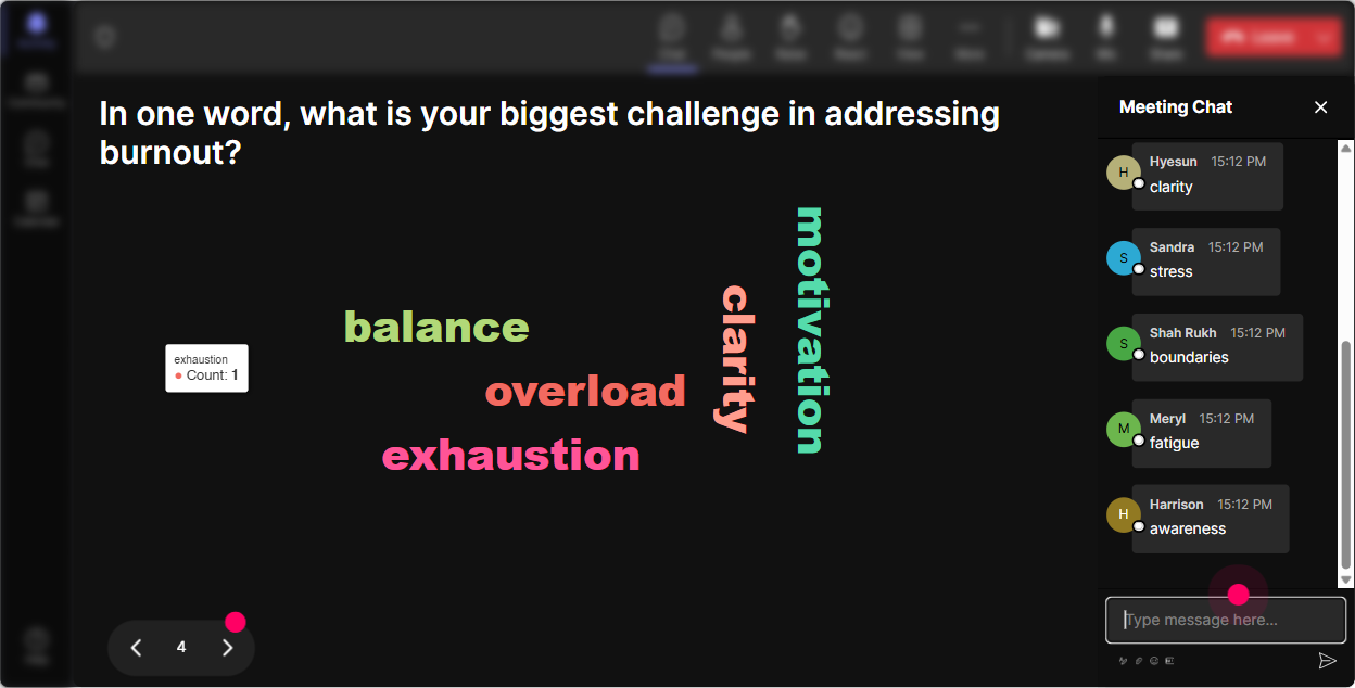 A word cloud is like letting the group speak all at once-without the chaos. Its amazing for burnout training because it surfaces emotion quickly and visually (and people realize theyre having similar experiences). Try prompts like: - In 12 words, what does burnout feel like? - What word comes to mind when you hear another change initiative? - What do you need more of right now? (One word) Trainer tip: Use Combine Similar Answers so tired, exhausted, and drained dont split the vote. Then reflect what you see: Okay, overwhelmed is huge. Lets talk about what overwhelmed actually looks like at work-before it becomes burnout.