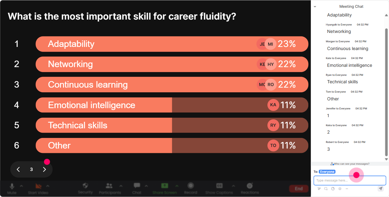 Before you teach anything, find out where people stand. Rating Polls make this fast and visual, and it helps you calibrate your examples. Use a 110 rating like: - How confident are you explaining Career Fluidity to a client/learner? (1 = not at all, 10 = I could teach it) - How supported do you feel to make career moves in your current org? (110) - How clear is your own next career step right now? (110) Trainer move: If the average is low, you know to slow down and define terms. If its high, you can shift into advanced stuff faster-career experiments, portfolio careers, internal mobility programs, and coaching conversations.