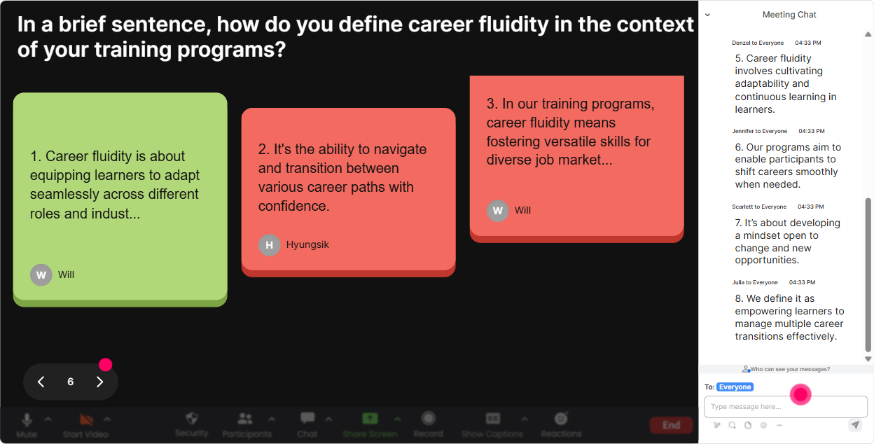 This is where Career Fluidity becomes real. Talking Tiles are perfect for longer responses that feel like actual human experiences-without you reading a wall of chat. Prompts that work really well: - Whats one career micro-move youve made (or want to make) in the next 90 days? - Describe a time you pivoted-what triggered it and what helped? - In your org, whats one thing that makes internal mobility easier/harder? Trainer move: Pick 23 tiles to spotlight and connect them to frameworks (transferable skills, identity shifts, opportunity spotting, networking, learning loops). People love hearing their words become part of the teaching.