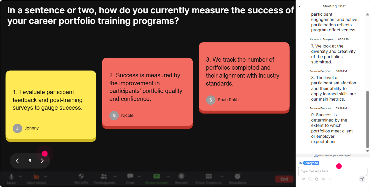 Before you teach anything, find out where everyones starting from. Rating Polls give you an instant confidence/experience snapshot-right in the chat-and you can adjust your pace without guessing. Ways to use Rating Polls in a Career Portfolios session: - Baseline confidence: On a scale of 110, how confident are you that your current career portfolio would impress a hiring manager? - Readiness check: Rate your portfolio readiness today (1 = I dont have one, 10 = its updated and shareable). - After a module: After that demo, how clear is portfolio storytelling now? (110) Trainer move: Call out what you see. Looks like most of us are around a 46-perfect. Well build it step-by-step, no pressure. People relax and participate more.