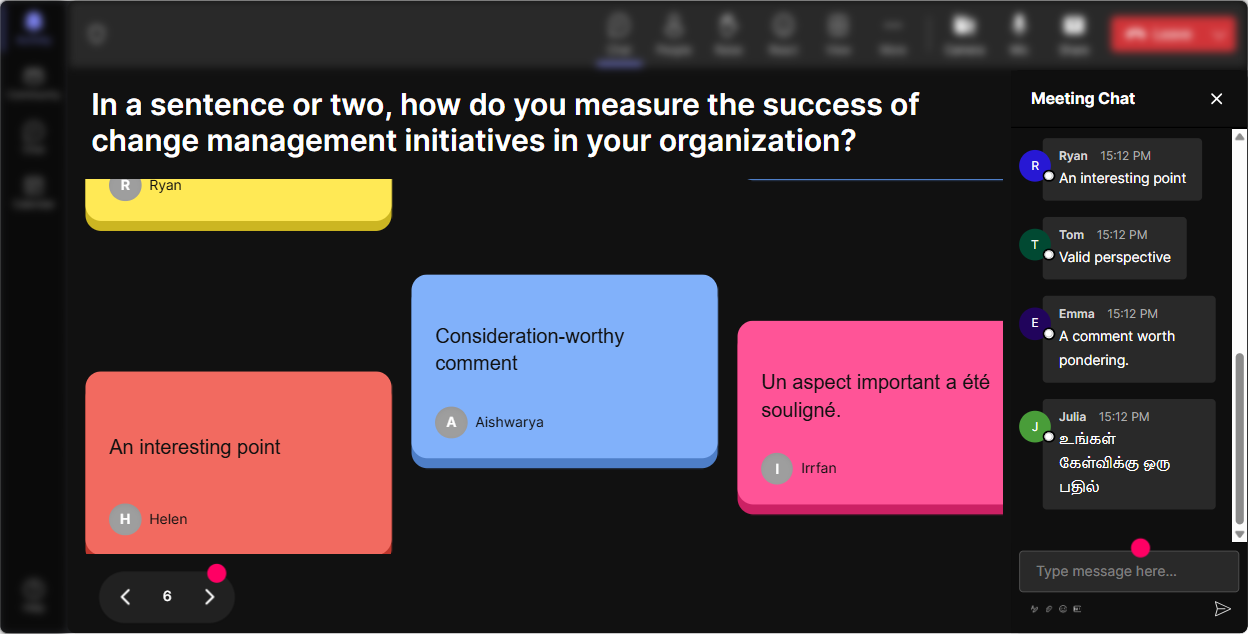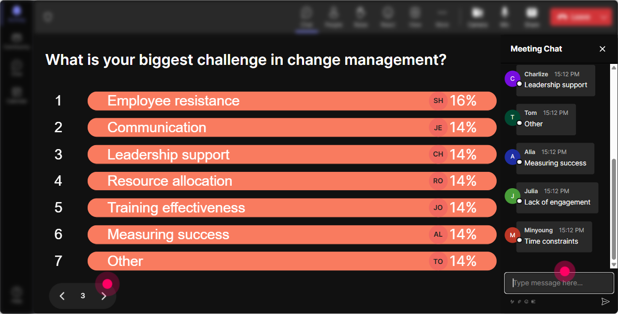Before you teach anything, find out where people *think* they are. Rating Polls are perfect for that because its low effort for them, but super useful for you. Use it like this: - On a scale of 110, how confident do you feel facilitating Change Management conversations? - Rate your current comfort level handling resistance in a live training room (1 = not comfortable, 10 = I can handle anything). - Mid-session pulse check: How clear is ADKAR / Kotter / our internal model so far? (110) How to make it engaging: - React to the results out loud: Okay, weve got a bunch of 6s and 7s-perfect. That tells me youve done this before, but you want sharper tools. - Use it to pace your session: if the average is low, slow down and add examples; if its high, move into scenarios and practice faster.