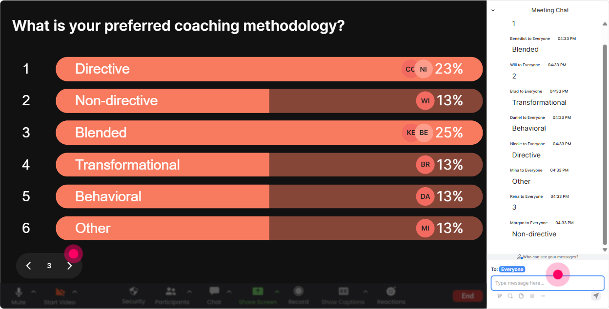 Coaching groups are usually mixed-some folks are brand new, others have been coaching for years (with very different definitions). Rating Polls let you measure the room instantly and adjust your pace. Ideas you can run in the first 5 minutes: - On a scale of 110, how confident are you in coaching a struggling performer? - Rate your comfort level with giving difficult feedback (1 = avoid it, 10 = bring it on). - How effective is your current coaching process today? (110) Trainer move: Show the results and say, Cool-looks like were split. Ill make sure we cover both the fundamentals and the real-life messy scenarios. People feel seen, and youve bought attention for the next segment.