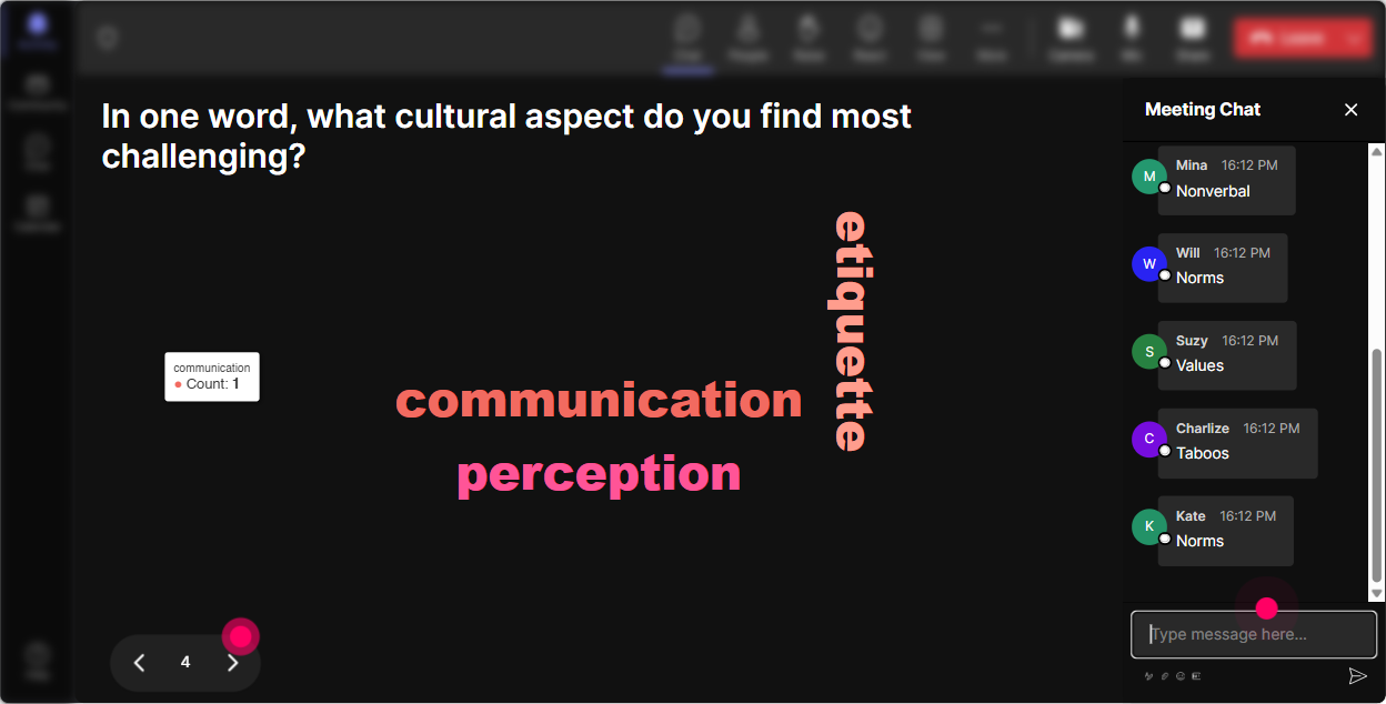When you want more than a one-word answer-use Talking Tiles. It turns longer chat responses into a visual moment, so people actually pay attention to what others are saying. Best ways to use it in this session: - Story prompt: Describe a moment when culture impacted a training session you delivered-what happened? - Application prompt: Whats one adjustment youve made to be more inclusive across cultures? - Scenario reflection: After a case study, ask: What would you say/do next as the trainer? and let the tiles roll in. Why it boosts engagement: people love seeing their message land on screen, and it creates that were building this together feeling instead of you lecturing solo.