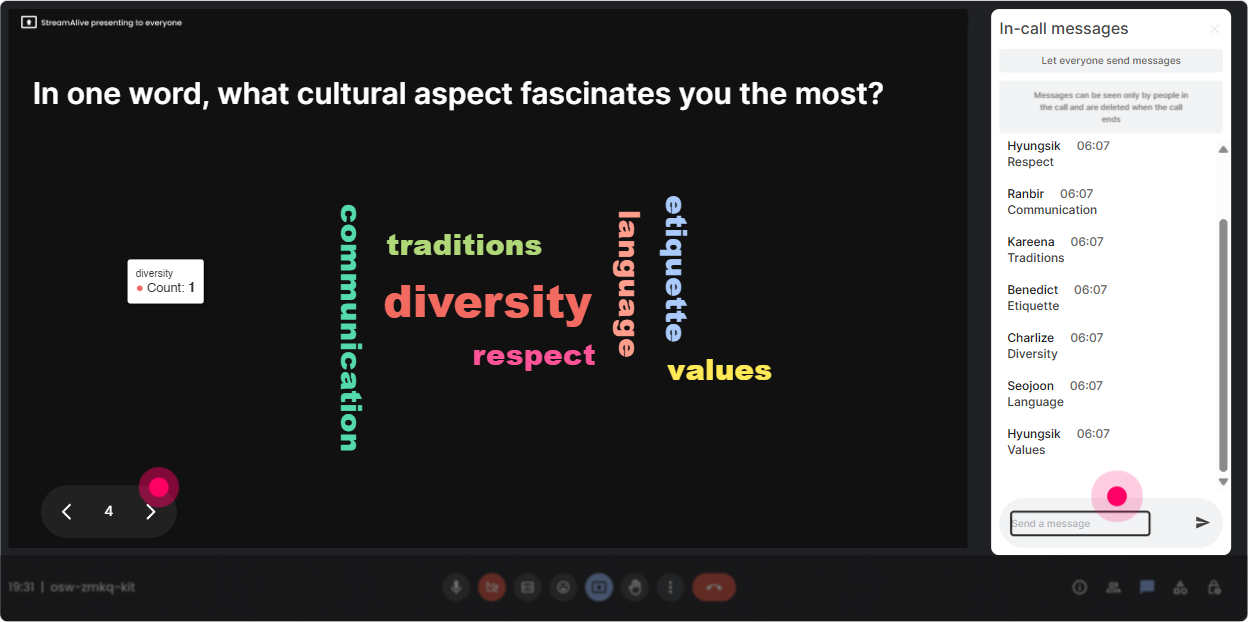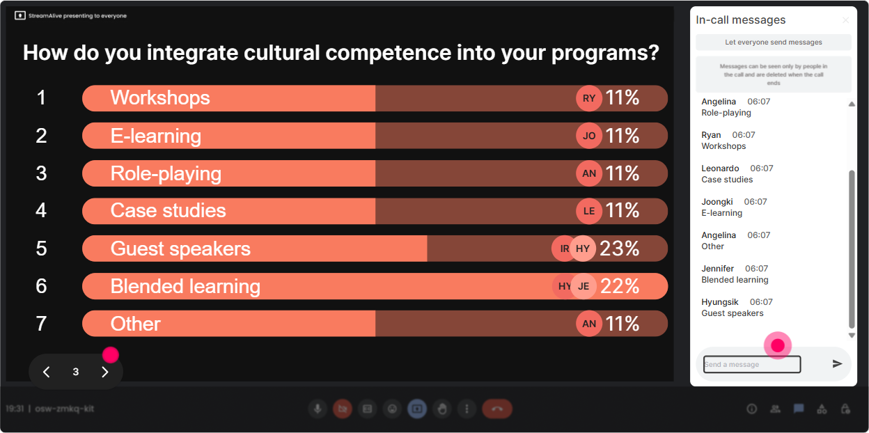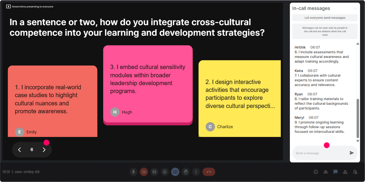 Cross-cultural topics trigger a lot of Is it okay to say this? energy. Quick Questions helps because StreamAlive collects questions from chat automatically, so youre not hunting through messages. How to use it during this training: - Set a norm early: Drop questions anytime-especially the messy ones. If youre thinking it, someone else is too. - Do two planned Q&A moments: - Midpoint: after frameworks/models - End: after practice/role plays Great prompts to invite the right kind of questions: - Whats a cross-cultural situation youre navigating right now? - Whats a conversation youre avoiding? Trainer tip: If a sensitive question comes in, you can answer it by focusing on behaviors, impact, and curiosity-not stereotypes.