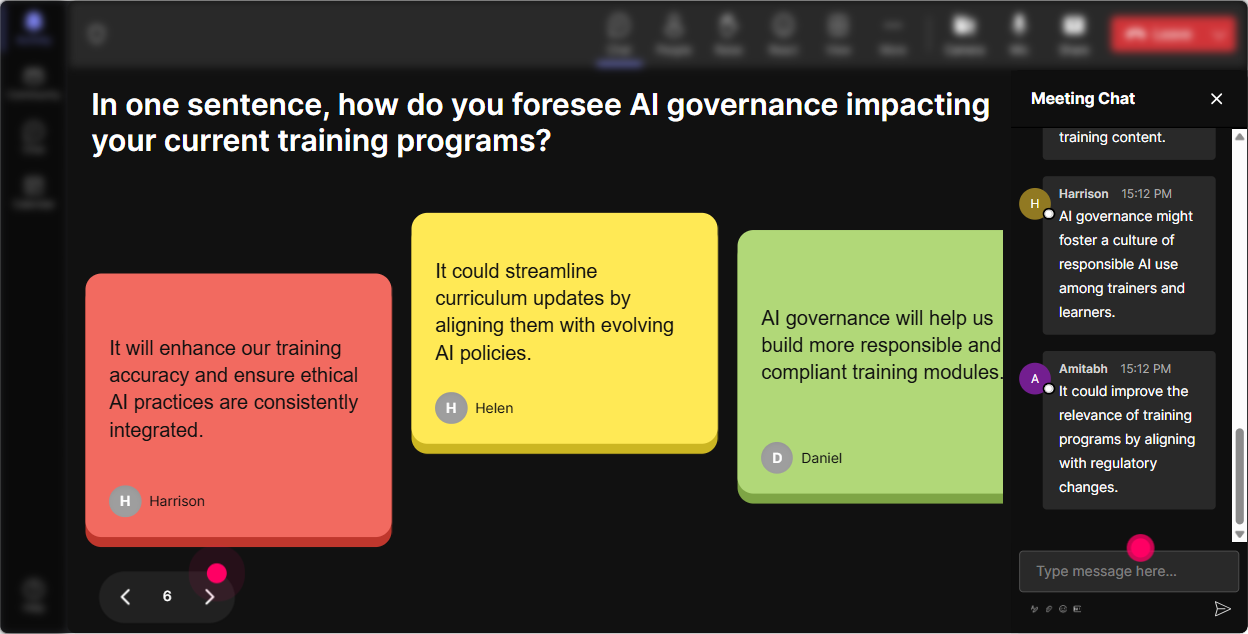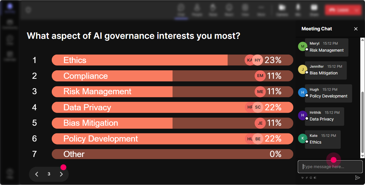 Before you teach anything, find out what youre working with. Rating Polls let people answer honestly in chat, and you instantly see the spread. Use cases (great at the start of each module): - On a scale of 110, how confident are you that your org could explain how an AI model makes decisions? - Rate your current AI governance maturity: 1 = Were winging it 10 = We have a formal council + controls + audits - How clear are roles today? 1 = No one owns it 10 = Crystal clear across Legal/IT/Security/HR Trainer move: Dont just show the average-react to the range. Weve got 2s and 9s in the same room. Perfect. Lets steal whats working from the 9s and make it doable for the 2s.