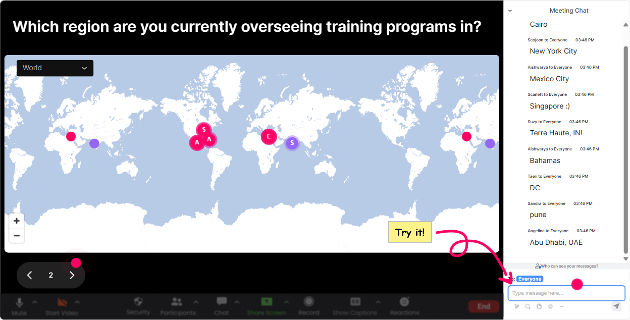 Start with the easiest win: get people typing in chat immediately. Pop open **Magic Maps** and ask something location-based so everyone participates without overthinking. **Why it works for Cross-Functional AI Governance:** governance is heavily influenced by geography-privacy laws, AI regulations, data residency, procurement rules, even cultural expectations. **Try prompts like:** - Where are you joining from today? City + country. - Where is your organizations biggest learner base located? - If your AI policy had to meet ONE regions rules first (EU/US/APAC), which would it be and why? (Have them type a location that represents it.) **Trainer move:** once the map populates, call out clusters: Interesting-lots of folks in the UK and India. Your governance risks might differ just based on data handling expectations. Instant relevance, instant engagement.