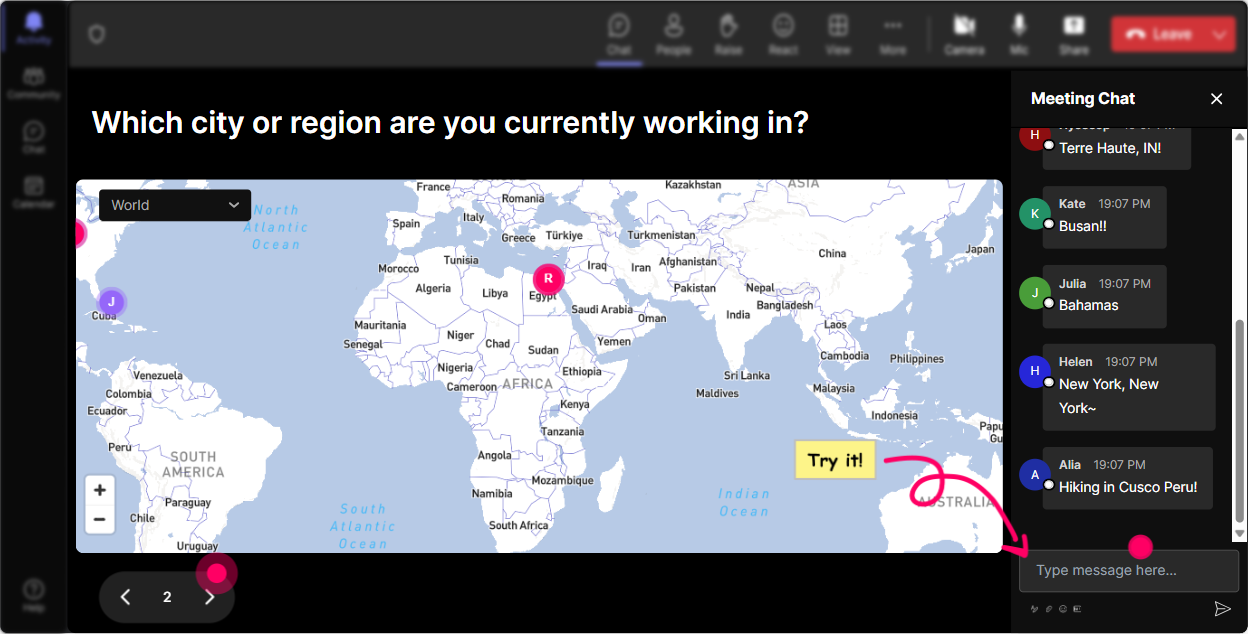 Want to break the ice right from the start of your training session? Use Magic Maps. Ask your team, 'Where in the world are you working from today?' This will sprinkle some fun and make everyone feel connected as you see their locations populate on a real-time world map. Instantly connect your global branch staff with just one question.