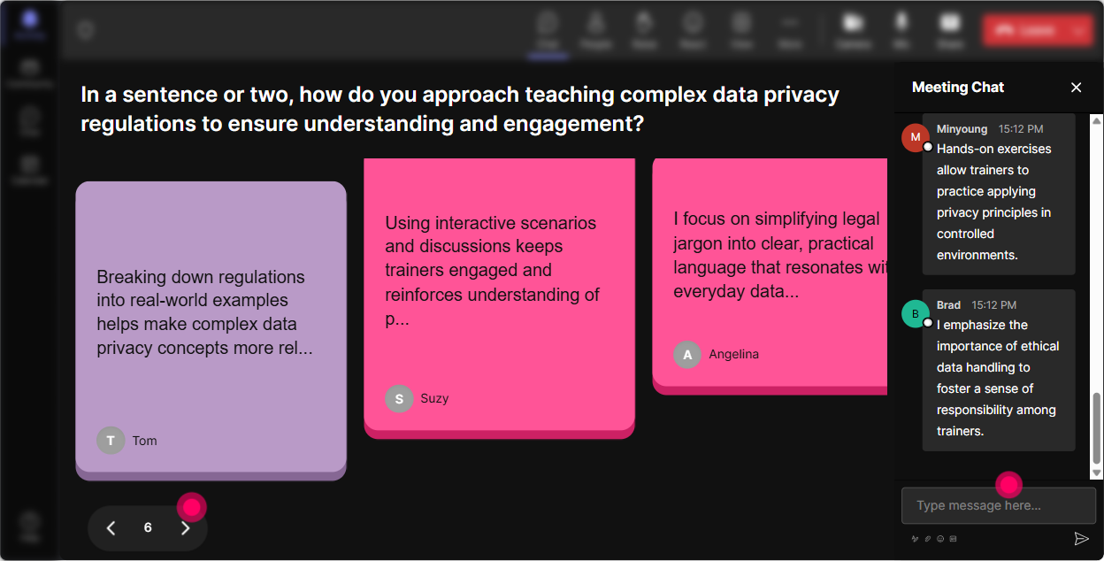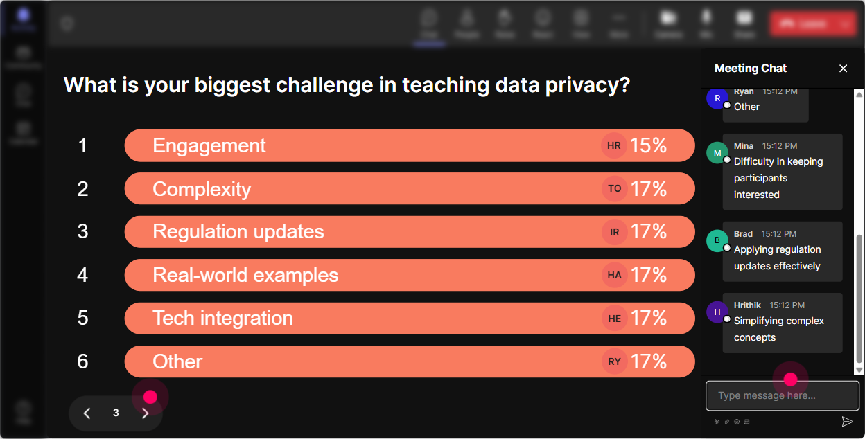 Before you dive into laws, policies, and definitions, find out where people are actually at. Rating Polls let you do a fast pulse check right in the chat-no awkward silence, no long survey. Use it at the start: - On a scale of 110, how confident are you explaining personal data to a new hire? - Rate your comfort level handling a data incident (1 = panic, 10 = Ive got a playbook). Use it mid-session: - How clear is the difference between data controller and data processor right now? (110) Trainer move: If the average is low, you can say: Got it-lets slow down and do an example together. People feel seen, and you look like youre adapting in real time.
