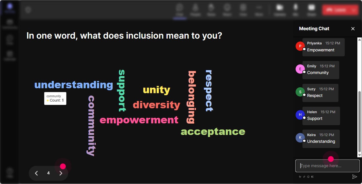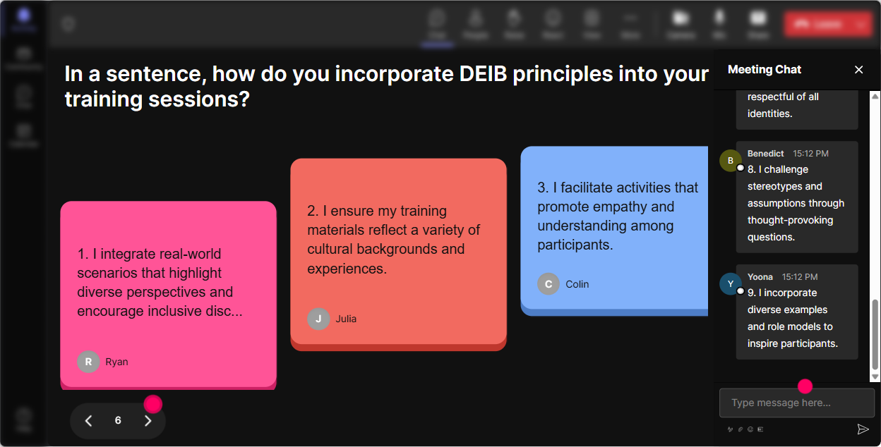 Talking Tiles is great when you want more than a one-word answer-like reflections, scenarios, or small stories. It makes the chat feel like its part of the session, not a separate side-channel. How to use it in DEIB ILT for trainers: - Impact prompt: As a trainer, where do you see DEIB showing up in your day-to-day work? - Scenario prompt: Share one moment where a participant said something that made the room tense-what happened? - Skill-building: Finish this: A small inclusion move I can make in my next session is Trainer move that works: pick 23 tiles to read out loud and say, If you relate, type same in chat. Suddenly youve got community, not just comments. Why this can drive 9x engagement: people can contribute without needing mic time, and seeing their words on screen nudges others to join in.