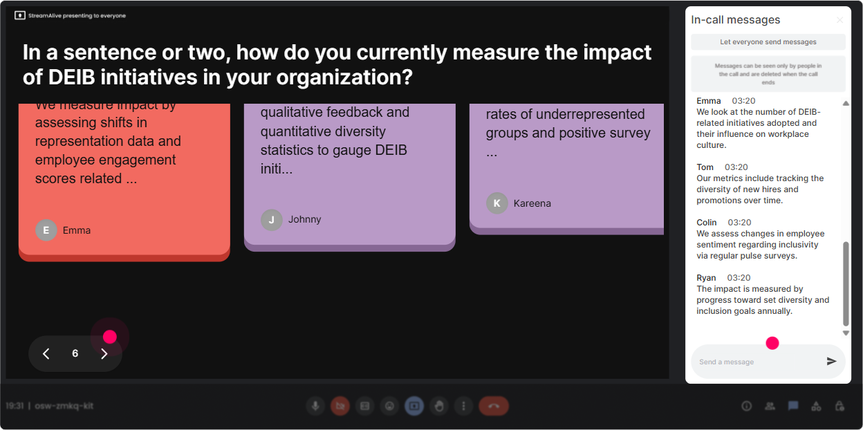DEIB sessions generate lots of Wait can I say this? questions, and they get buried in chat fast. StreamAlives Q&A pulls questions out and organizes them so you dont miss the important stuff. Ways to use Q&A in a DEIB ILT: - Park tough questions safely: Drop your honest questions anytime-StreamAlive will capture them and well handle them in the last 15 minutes. - Make it practical: Ask me anything about facilitating pushback, senior leader resistance, or global cultural nuances. - Use it for scenario coaching: Whats one DEIB situation youre dealing with right now that you want help thinking through? Trainer move: When you answer, model inclusive language. People learn as much from *how* you respond as *what* you say.