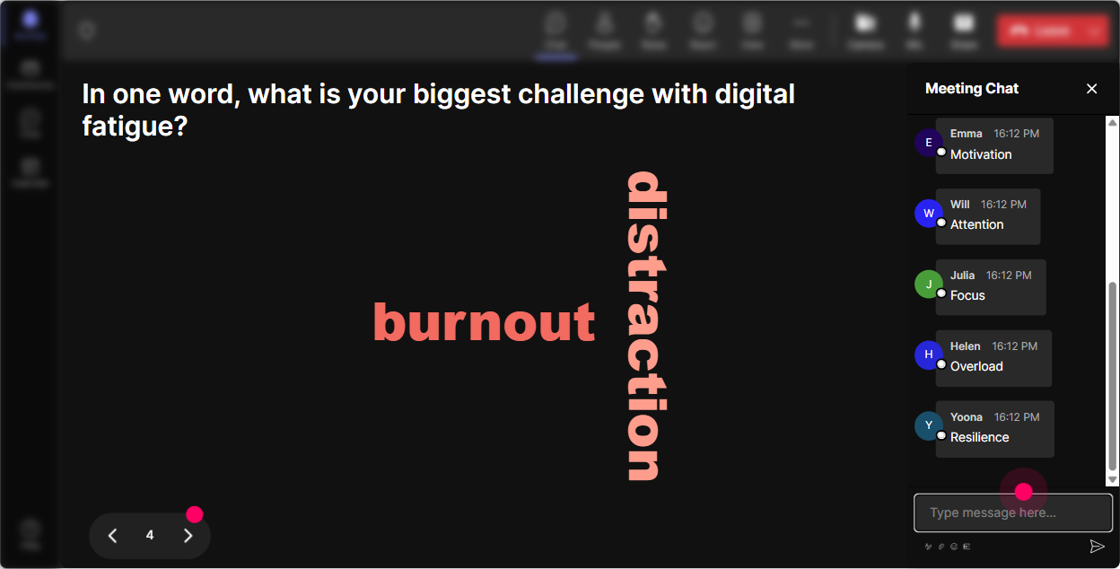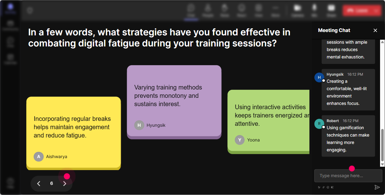 Talking Tiles are perfect when you want responses longer than a word, but you still want it to feel light and playful. People type in chat, and their messages become part of the visual experience-so it feels like the group is building something together. Use it for practical, trainer-friendly prompts: - Whats one moment in virtual training when you feel the room drop? - Whats a learner behavior that tells you theyre fatigued? - Whats one change you made that reduced fatigue instantly? Why this helps with digital fatigue specifically: - It breaks the trainer talks, learners listen pattern. - It makes the chat feel meaningful (not just side-noise). - It gives you a pile of real examples you can reference for the rest of the session: Im seeing camera-off silence and no one answers a lot-lets tackle those next.