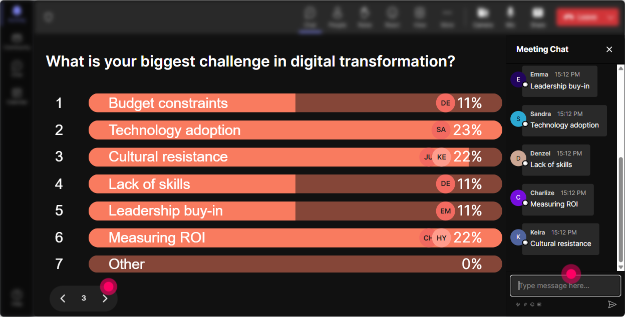 Quizzes are awesome for L&D leader audiences because theyre short, competitive (in a good way), and they surface misconceptions fast. And because answers come through chat, it feels light-not like an exam. Quiz questions that fit Digital & Global Organizations: - Which is the BEST example of a digital operating model shift? 1) Moving files to SharePoint 2) Redesigning decision-making using real-time data 3) Buying new laptops 4) Creating more meetings (Correct: 2) - What usually breaks first in global teams? 1) Talent 2) Strategy 3) Communication + handoffs 4) Branding (Often: 3) Trainer tip: After you reveal the correct answer, ask: If you picked something else, what made it feel right? Thats where the learning happens.