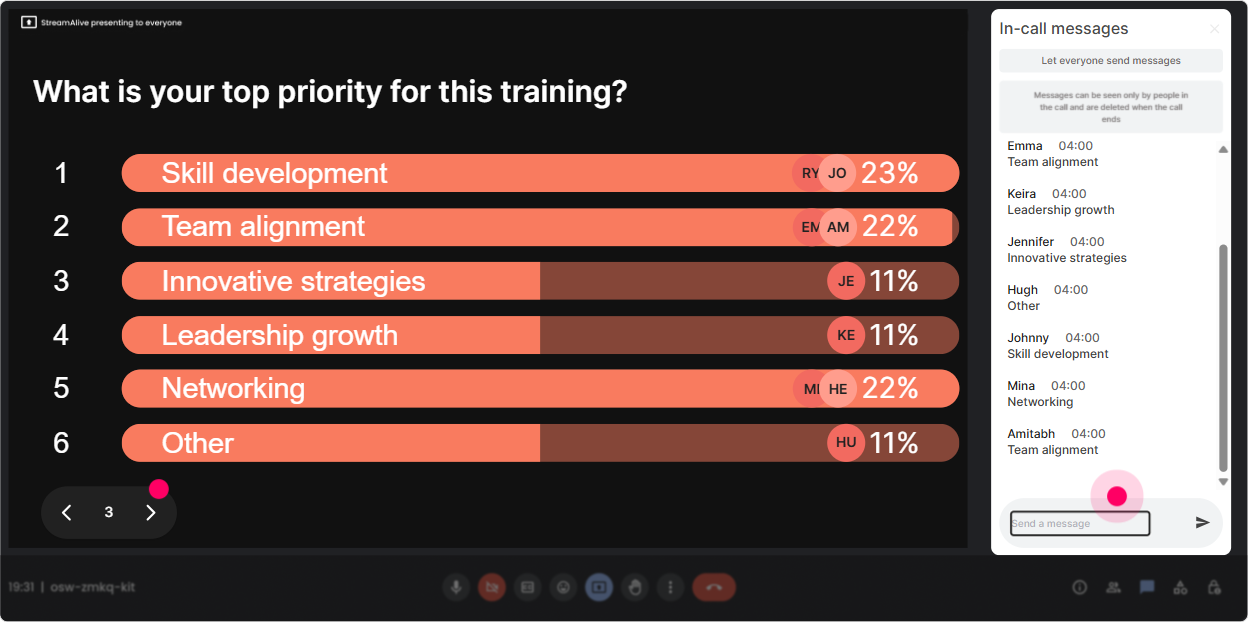 After the session, StreamAlive analytics help you see what actually landed-minute by minute-so you can improve your run-of-show and show stakeholders that this wasnt just a nice webinar. What to look at for Enablement ILT: - Minute-by-minute engagement: Spot where attention dipped (was it a long explanation? a dense slide?) and where it spiked (polls, stories, examples). - Chat replay + interaction reports: See which questions, prompts, and activities got the most responses-then reuse those next time. - Fantastic Fans (most engaged participants): These are often your future champions. Follow up with them for pilot programs, testimonials, or internal advocacy. - Shareable reports: Email results to yourself or your team, or recap in Teams-Heres what the cohort voted as top enablement priorities. Trainer tip: Use analytics like a trainer-coach: keep what works, cut what drags, and double down on the moments where the audience clearly leaned in.