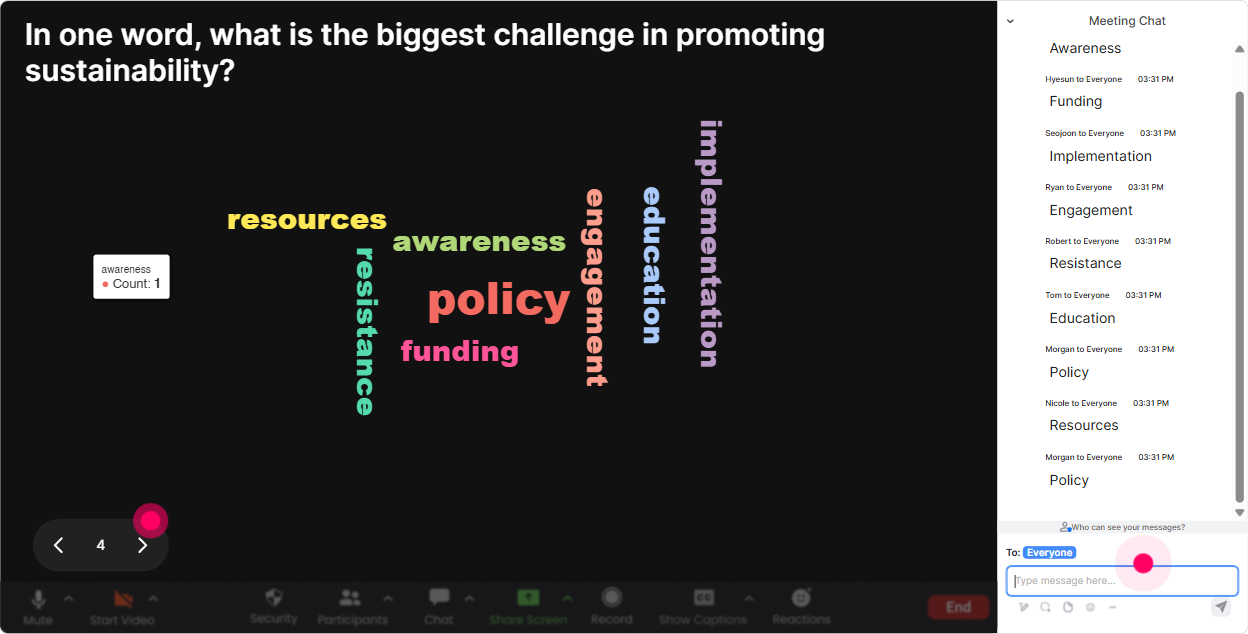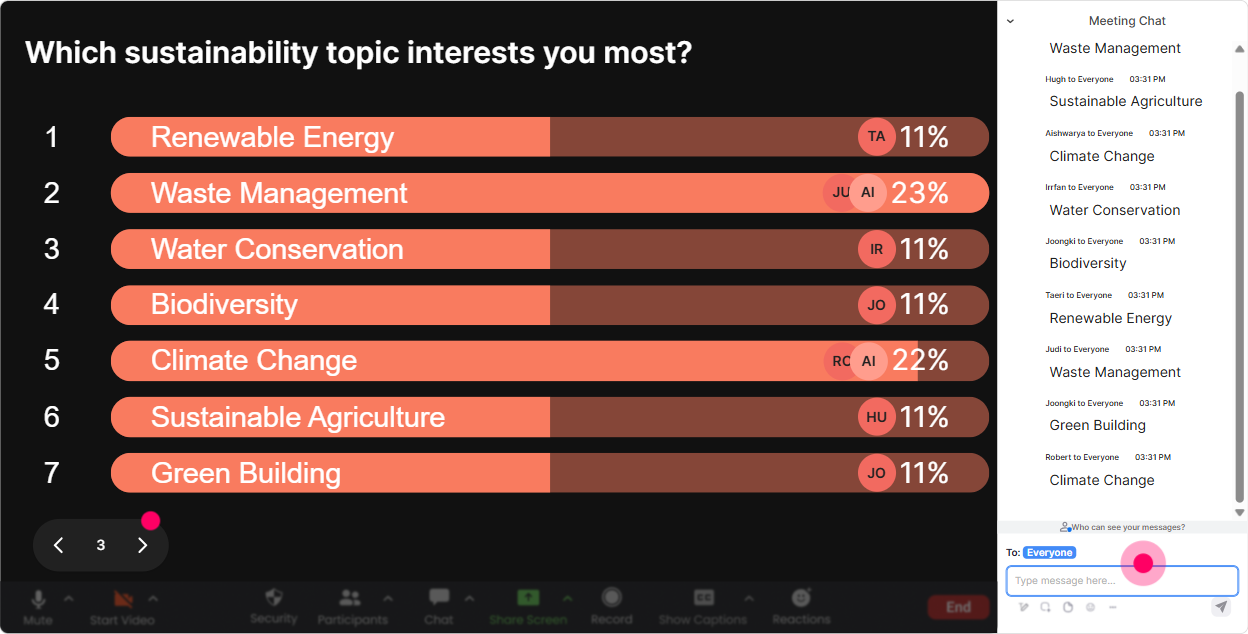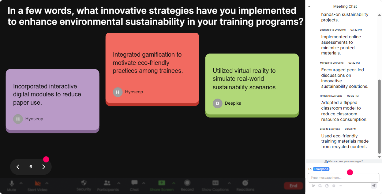 When you need longer responses-ideas, examples, mini-stories-Talking Tiles makes the chat feel alive and visible. This is gold for sustainability because people learn best from real scenarios, not definitions. Prompts that work really well: - Whats one sustainability quick win you could implement in your next training delivery? - Where do you think your training agency creates the most environmental impact today? - Share one client expectation that makes sustainability harder (and how youd reframe it). - Whats one change youve tried before that didnt stick-and why? Trainer move: As tiles fall in, pick 23 and react like a host: This is a great one okay who else is seeing this? It validates contributors and gently pulls quiet folks in because their message might get featured next.