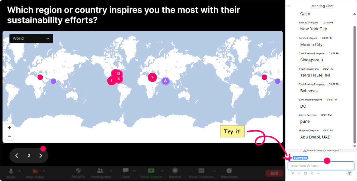 Start with something everyone can answer instantly-where theyre joining from-and then smoothly pivot to sustainability. Magic Maps is perfect for that because the chat turns into a live world map in seconds. Try warm-ups like: - Where are you joining from today? (easy win, gets fingers moving in chat) - Name a city you think is doing sustainability really well. (hello, instant case studies) - Where have you personally seen climate impacts-floods, heat, wildfires-up close? (makes it real, fast) - If your agency could run one sustainability pilot in any location, where should it be? Trainer move: When you see clusters pop up (say lots of people from one region), call it out and ask a quick follow-up: Whats the biggest sustainability challenge in your area-waste, energy, water, travel? Youll get local context without having to guess what matters to the room.