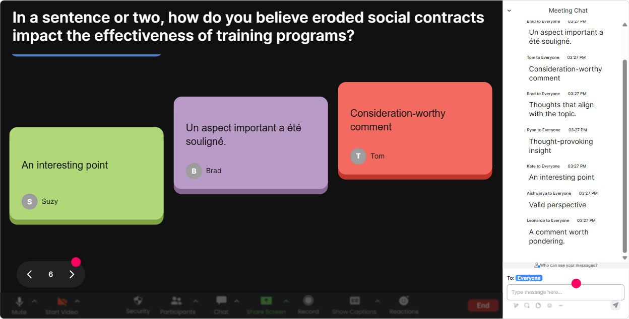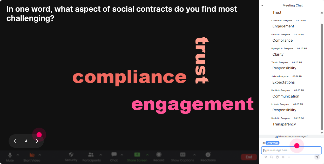 Talking Tiles is great when you want longer responses-mini stories, examples, reflections. Instead of you begging for volunteers, everyone can contribute in chat and their responses become visual tiles on screen. Use it for practical, job-relevant reflection: - Whats one unwritten rule at work that people USED to believe in, but dont anymore? - Describe a moment when you felt the deal changed at work (expectations, workload, recognition, flexibility). What happened? - How does an eroded social contract show up in training environments specifically (attendance, attention, resistance, cynicism)? - Whats one thing leaders do that accidentally breaks trust, even if they mean well? - Finish this sentence: If trust was higher here, I would Trainer tip: Call out patterns you see across tiles: A lot of you mentioned more work, same pay and no follow-through. Thats the contract breaking in real time-effort goes up, return doesnt.