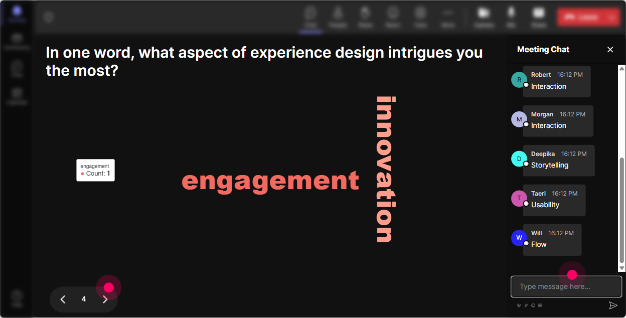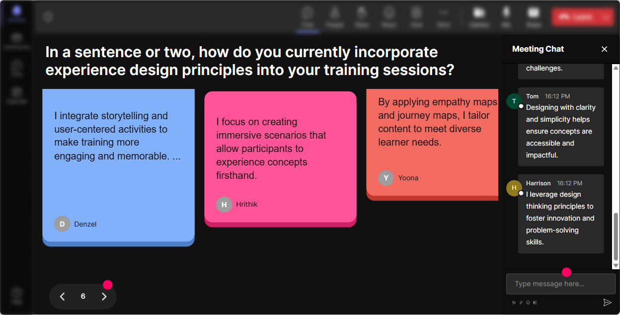 When you want more than one-word answers-use Talking Tiles. It turns chat into a living wall of participant stories, which is exactly what Experience Design needs. Prompts that work really well: - Impact question: Where in your job would better Experience Design make the biggest difference? (Onboarding, product training, leadership programs, compliance, etc.) - Story pull: Tell me about a training session you delivered that felt flat. What happened? Youll get patterns you can design against. - Application prompt: Whats one moment in your current training that youd love to redesign? (You can later pick 12 tiles and workshop them live.) Trainer trick: When the tiles fall in, narrate it like a sports commentator: Okay Im seeing onboarding compliance camera off silence yup, been there. It keeps energy high.