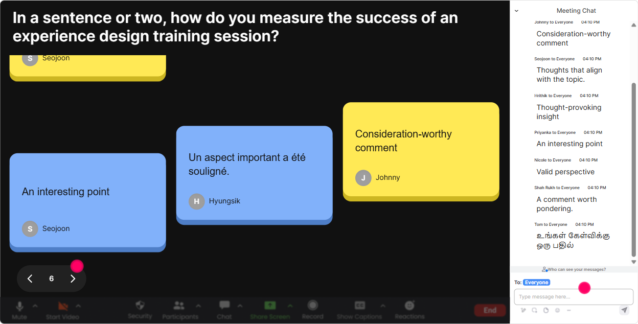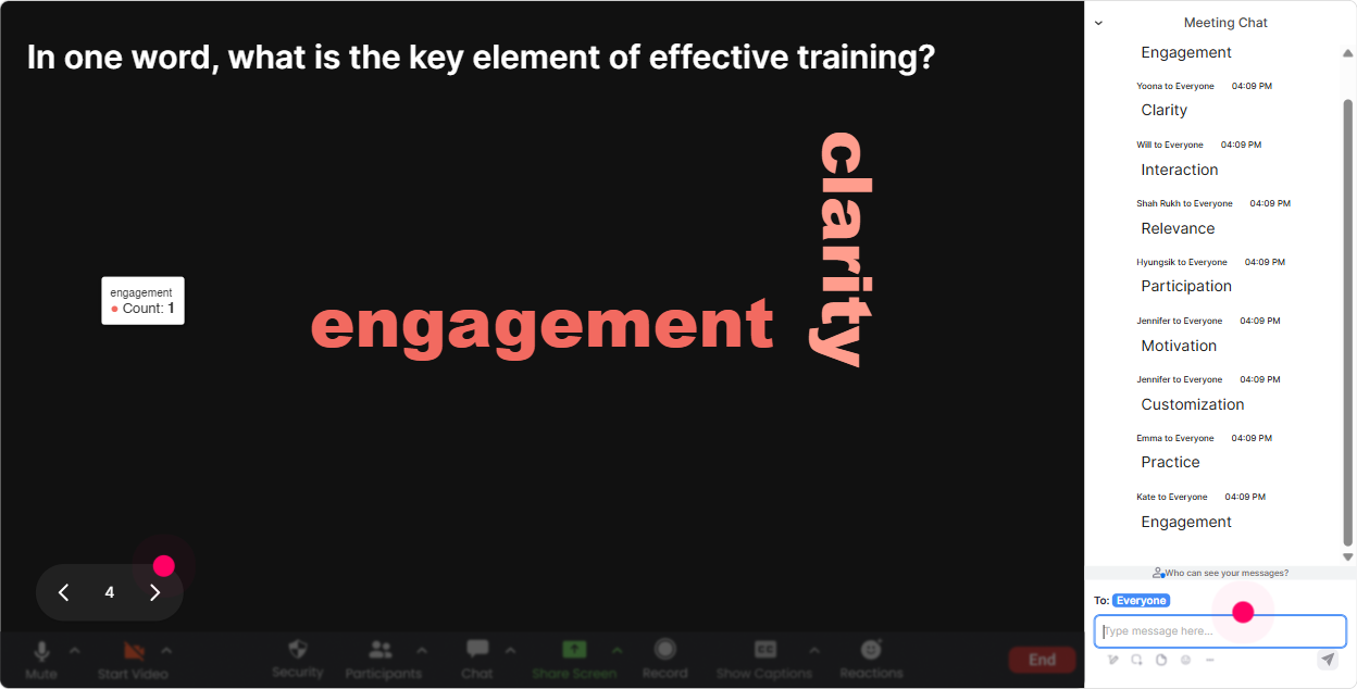 Talking Tiles is when you want more than one-word answers. People type in chat and their responses show up as falling tiles on screen-so it feels like the group is building something together. Use it during Experience Design training like this: - Describe a training moment youve seen that was truly designed (not accidental). What made it work? - What impact would better Experience Design have on your role or your agencys programs? - Whats one learner complaint you hear often (bored, too fast, irrelevant, etc.)? Trainer tip: After 2030 tiles, pause and do a quick pattern callout: Im seeing a theme: relevance, pace, and interaction. Now your next section feels customized-even if your deck was built weeks ago.