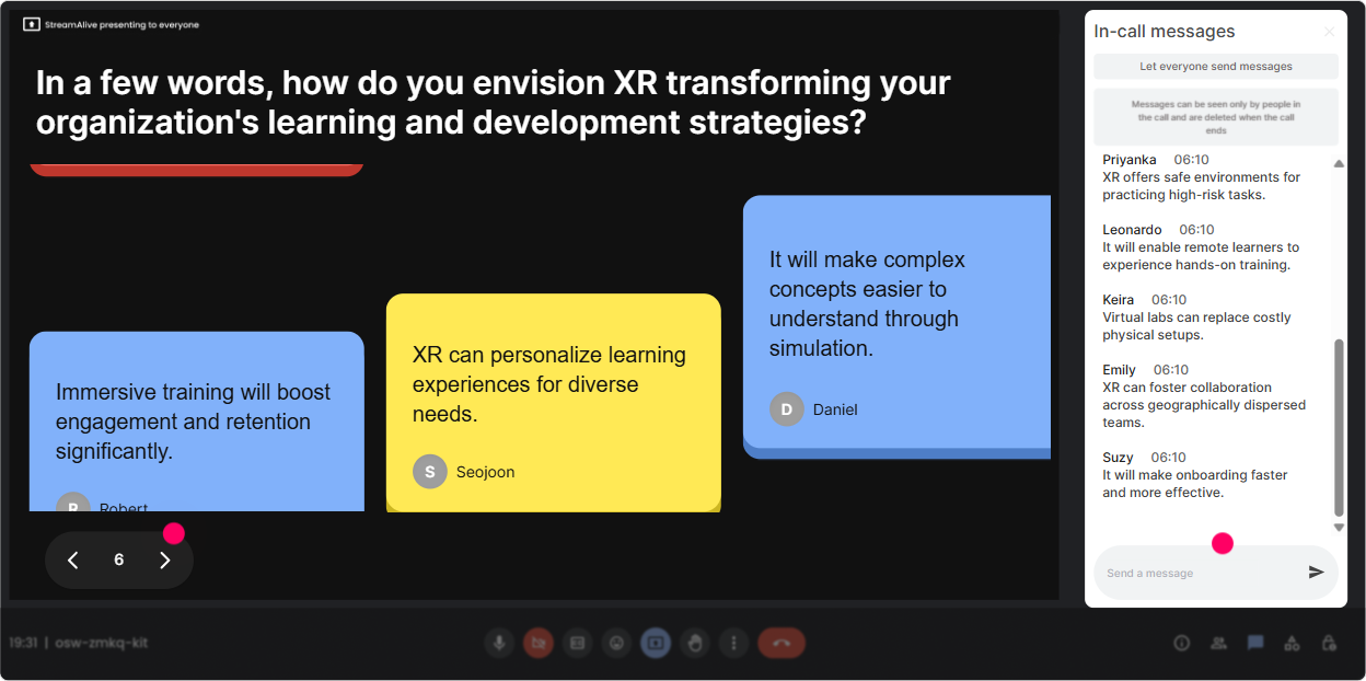 XR sessions generate tons of questions-devices, vendors, IT/security, motion sickness, cost, content creation and its easy to miss things in a fast chat. StreamAlive pulls questions from the chat and organizes them so you can actually manage them. How to use it in your XR ILT: - Do a Parking Lot moment: Drop your XR questions anytime-StreamAlive will capture them. - Mid-session: Lets do a 3-question sprint before we jump into the next demo. - End: Top questions I saw were about hardware, measurement, and stakeholder buy-in-lets hit those. Trainer move: Tell them they dont need a special Q&A box. Just type it in chat like normal. That removes friction, so you get more (and better) questions.