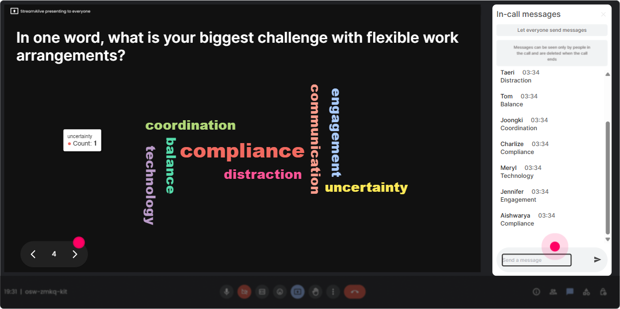 Flexible work can trigger strong opinions. Word Cloud is a low-pressure way to let people share what theyre thinking without writing an essay. Use prompts that are 12 words: - Flexible work is: ____ (youll get words like freedom, chaos, trust, fairness) - The biggest risk of flexible work is: ____ - One word: what do leaders misunderstand about hybrid? - The hardest part to get right is: ____ Trainer move: pick the top 23 biggest words and build your agenda around them: Okay, fairness and visibility are huge. Lets tackle those first. Thats how you turn a generic ILT into a session that feels custom.
