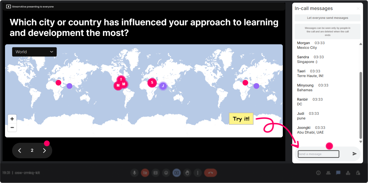 Flexible work looks different depending on region, labor laws, commuting culture, and even weather-so starting with location instantly makes the topic feel real. How to use it in this training: - Icebreaker (classic but always works): Where are you joining from today? - Tie it to the topic: If your company went fully flexible tomorrow, which city would you work from? - Policy reality check: Which country/state is your HR policy designed for? Trainer move: once the map populates, call out clusters ("Looks like weve got a Toronto crew") and ask one quick follow-up: Whats the #1 flexibility request youre seeing there? Now youve got instant context and momentum.