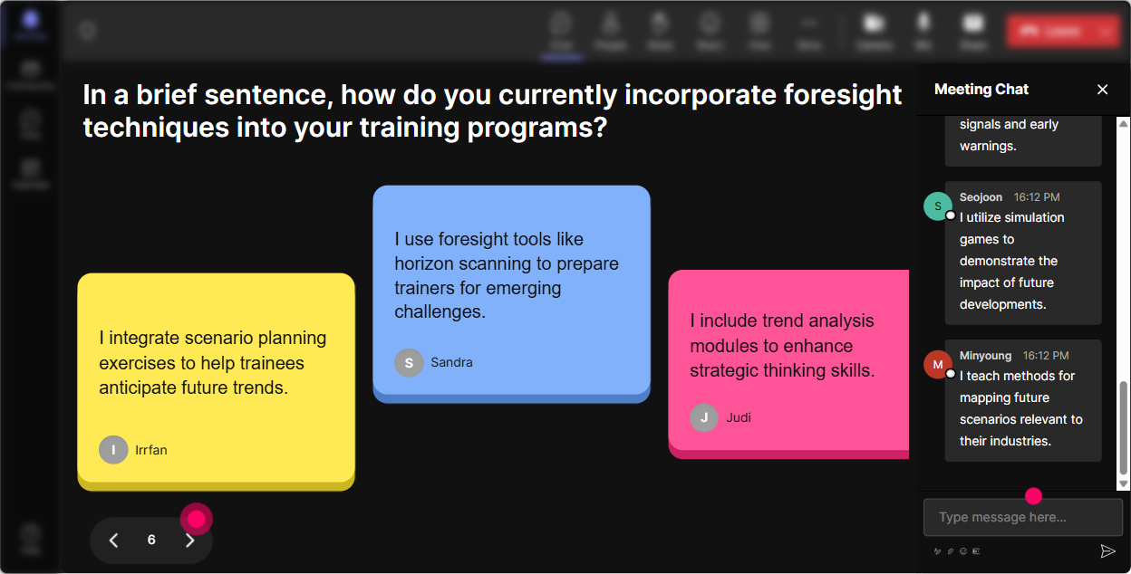 Talking Tiles are great when you want richer input than a word cloud-like mini stories, examples, and real workplace context. Use it for: - Role impact: Where could foresight make your job easier-or your training more impactful? Share a quick example. - Signal spotting: Whats one change youve noticed in your industry in the past year that others might be underestimating? - Scenario building: Finish this sentence: In 2030, corporate training will be more ______ because ______. Trainer move: - Read 35 tiles out loud and group them: Im seeing a cluster around AI, another around attention spans, and another around leadership buy-in. That clustering is exactly what we do with signals. It feels like collaboration, not trainer talking at people.